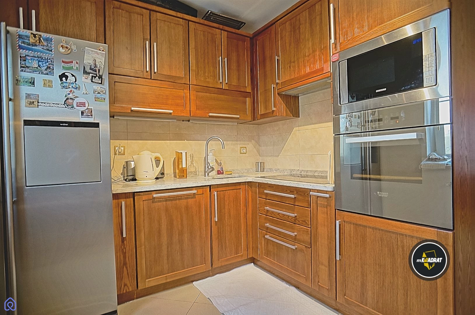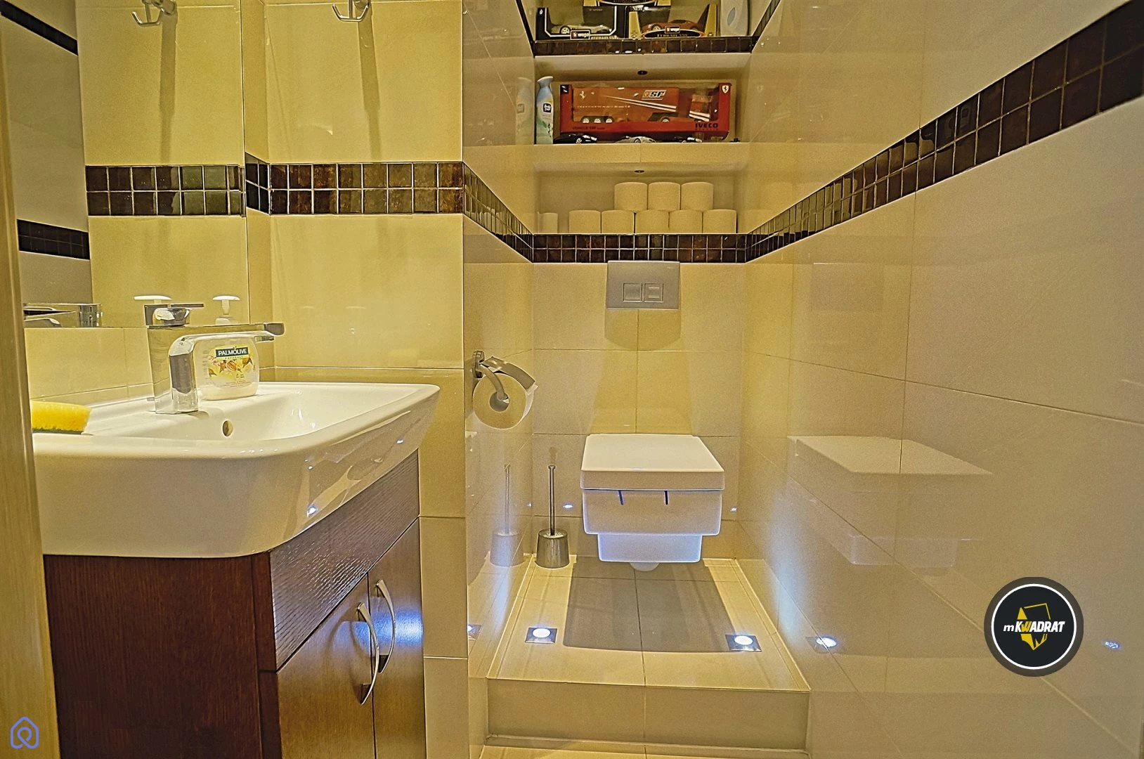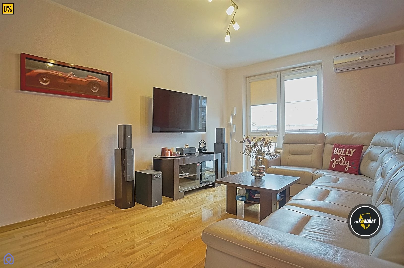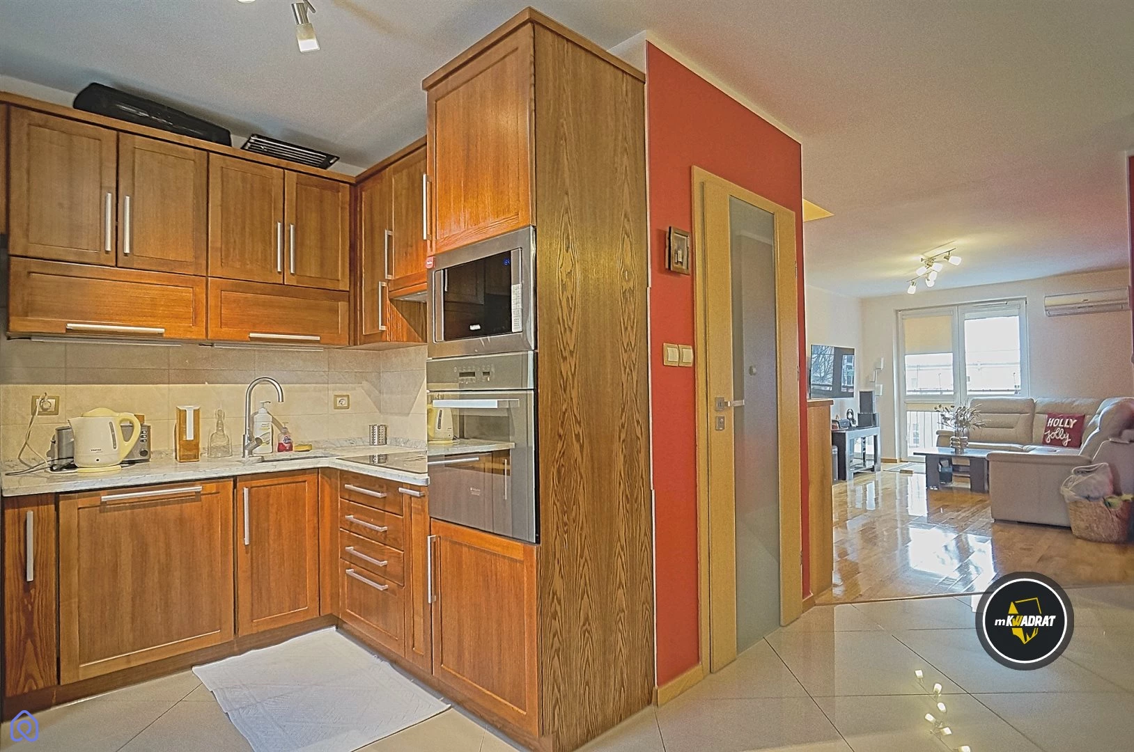 Na pierwszym poziomie znajduje się salon z balkonem, jadalnia z aneksem kuchennym oraz wc. Drugi poziom to dwie sypialnie i duża łazienka z wanną prysznicem i sauną. W łazience ogrzewanie podłogowe a wszystkie pokoje są klimatyzowane.