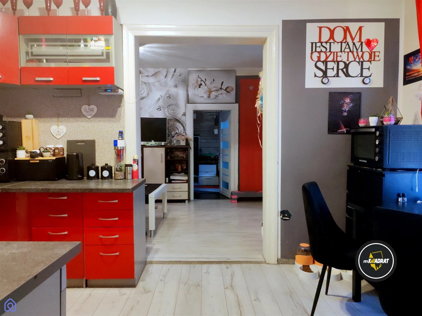 Układ lokalu na obecne czasy nietypowy, jednak bardzo funkcjonalny i stwarzający wrażenie przytulnego - mieszkanie przejściowe. Po wejściu, z przestronnego przedpokoju z dużą szafą przechodzimy do kuchni z której mamy wejście do łazienki oraz przejście do salonu. Z salonu można przejść do wydzielonej sypialni oraz dalej do kolejnego pomieszczenia, które również składa się z dwóch stref – dziennej i sypialnej.