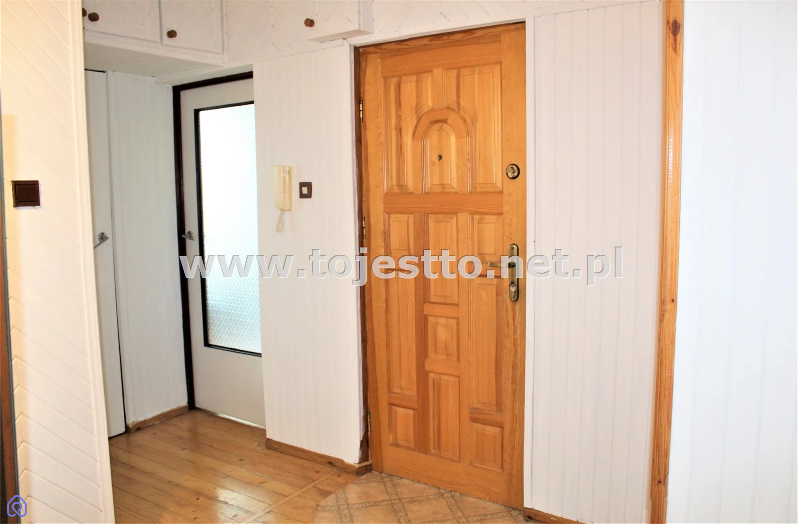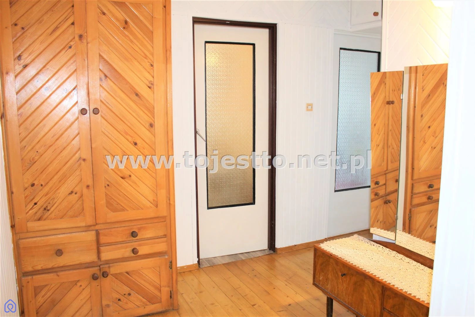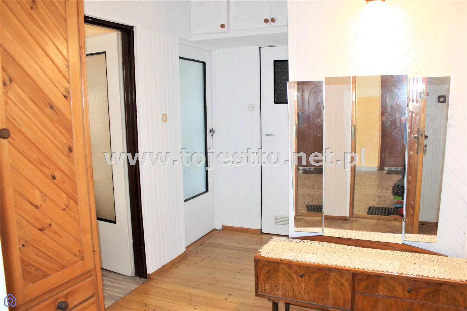 podłoga drewniana, na ścianach boazeria, korytarz wyposażony w pojemne pawlacze, oraz w zabudowane obszerne szafy łazienka powierzchnia ok. 3,60m2,