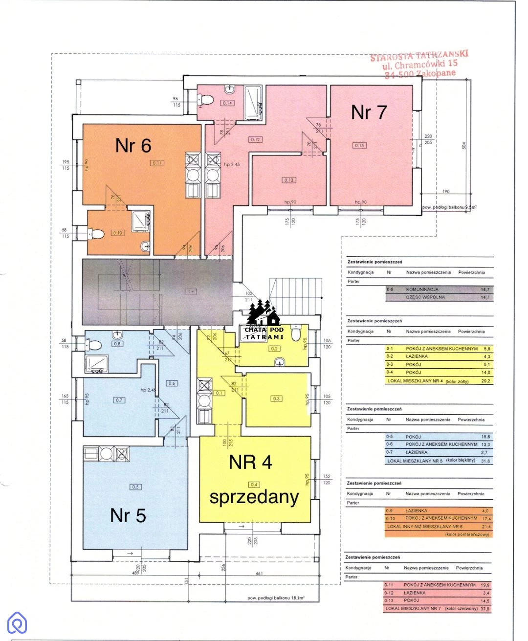 Biuro nieruchomosci Chata pod Tatrami rozpoczęła sprzedaż apartamentów w nowym budynku , usytuowanym na widokowej działce z bardzo dobrym dojazdem drogą asfaltową.Budynek drewniano-murowany dwu piętrowy z użytkowym poddaszem. W budynku 12 apartamentów , wszystkie z widokowymi balkonami lub tarasami ziemnymi ,do których można za dodatkową opłatą dokupić komórkę lokatorską oraz dodatkowe miejsce postojowe.Kilka dodatkowych miejsc postojowych zadaszonych. Budynek posadowiony na działce o pow. około 1100 m2, która stanowi części wspólne, wydzielone tarasy ziemne do mieszkań na parterze ( do wyłącznego korzystania), miejsca postojowe.Lokal nr 7 to lokal mieszkalny 2 pokojowy ( sypialnia, dzienny pokój ,aneks kuchenny, widokowy balkon ) do którego ceny podanej w ofercie należy doliczyć VAT 8%, Woda i kanalizacja gminna . Ogrzewanie ekologiczne - panele fotowoltaiczne i maty elektryczne podłogowe. Na rzucie lokal zaznaczony kolorem różowym.