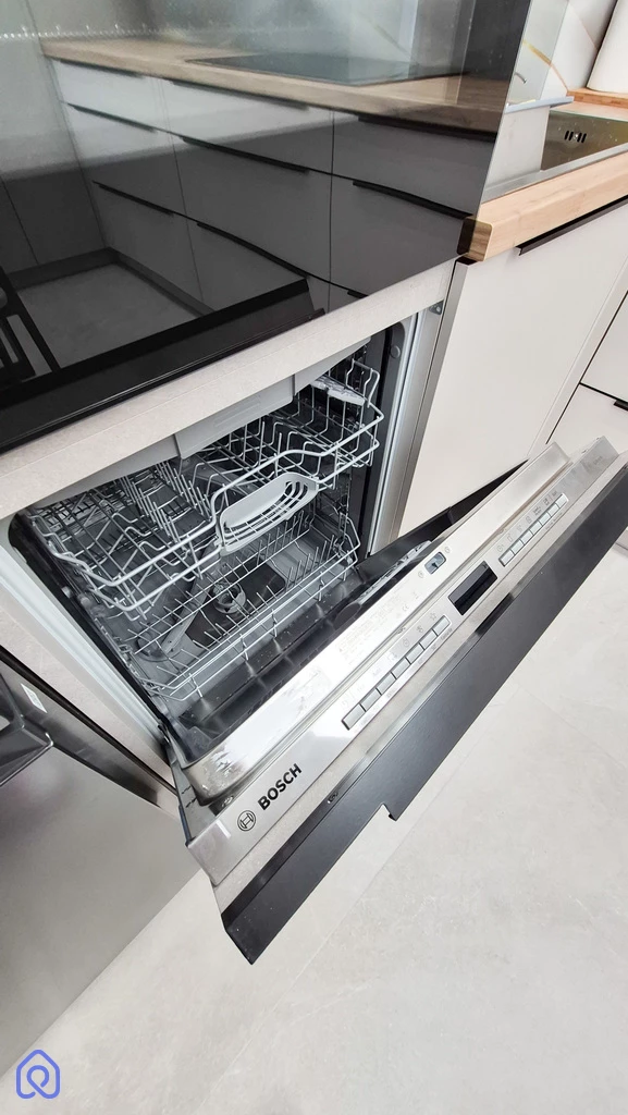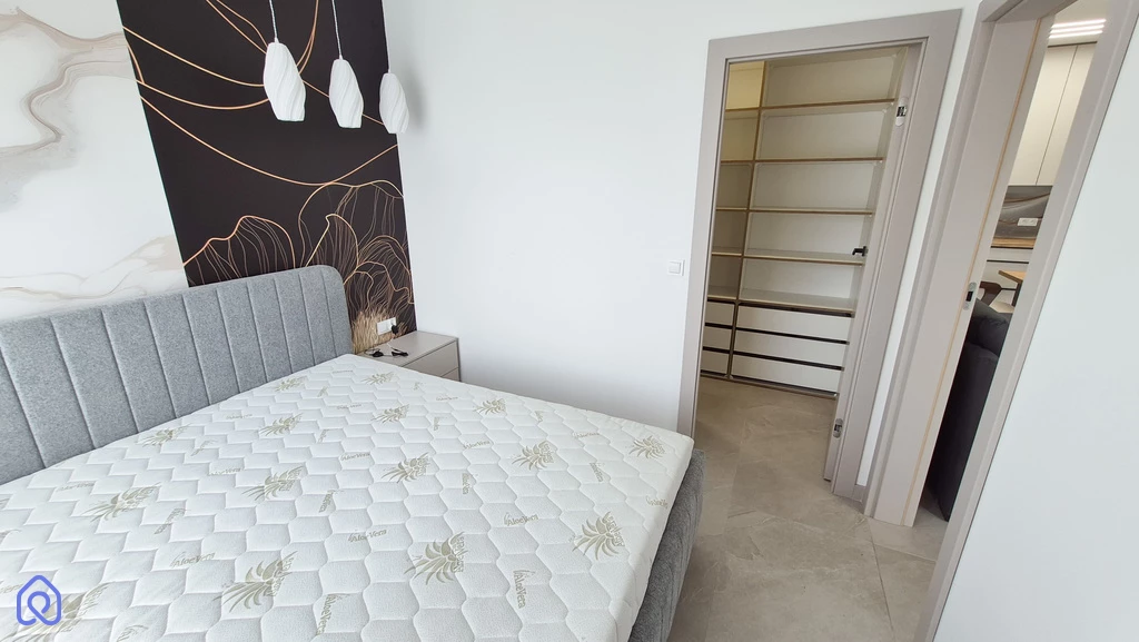 W sypialni czeka na Ciebie duże małżeńskie łóżko, a za drzwiami znajdziesz przestronną garderobę z pełną zabudową sięgającą sufitu. Łazienka imponuje nowoczesnymi rozwiązaniami, w tym toaletą na pilota oraz dużą kabiną prysznicową. Znajdują się tam również nowa pralka i suszarka bębnowa oraz zabudowane meblowo szafki, które zapewniają mnóstwo miejsca do przechowywania.
