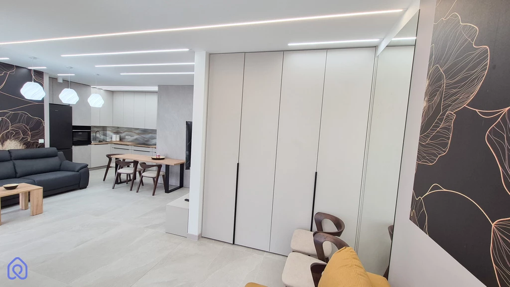 Apartament oferuje przestronny salon połączony z aneksem kuchennym. Nowoczesne, LED-owe oświetlenie dodaje wnętrzu wyjątkowej atmosfery. Kuchnia charakteryzuje się zabudową meblową wykonaną przez stolarza, wyposażoną w sprzęty najwyższej klasy, takie jak piekarnik, zmywarka, czy duża lodówka Samsung. Znajdziesz tu również dedykowaną wnękę na ekspres do kawy oraz liczne, praktyczne szafki i spiżarkę.