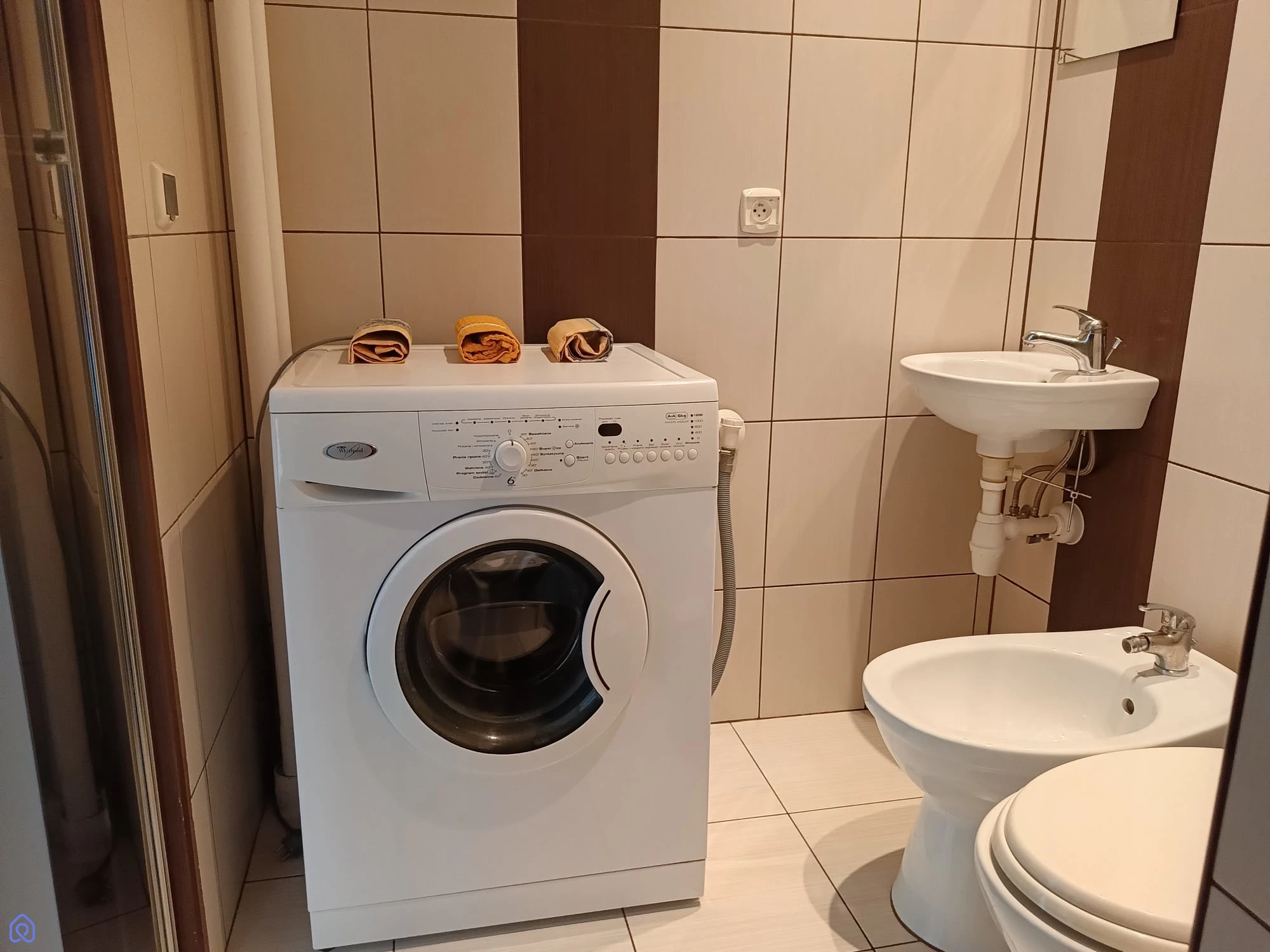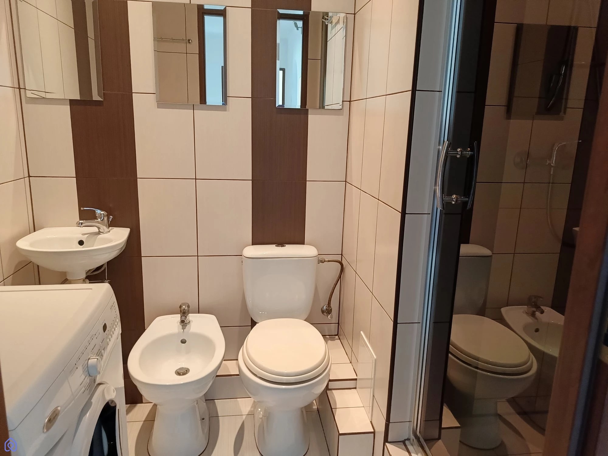 Łazienka po generalnym remoncie, wyposażona w pralkę, umywalkę, bidet, toaletę oraz kabinę prysznicową.