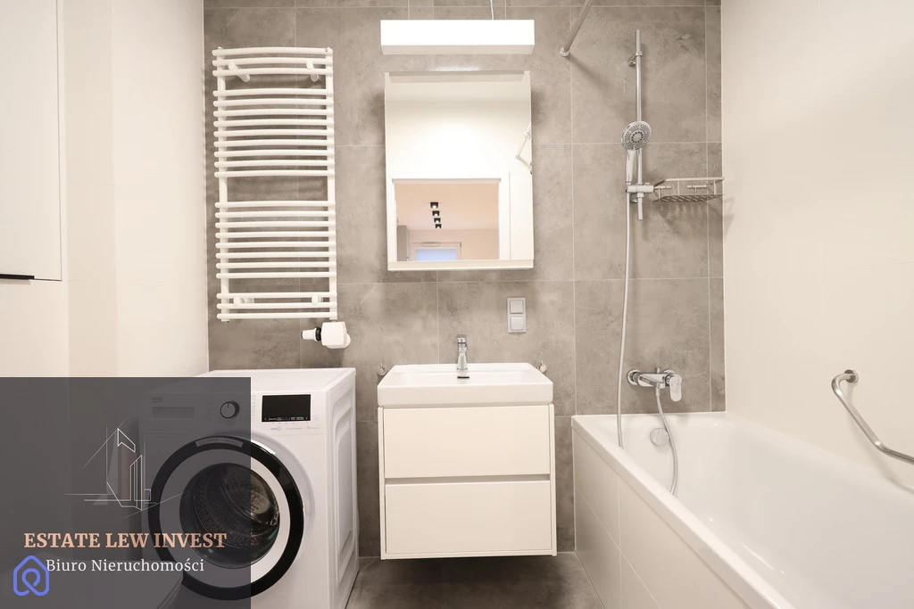 - łazienka wyposażona w wannę, pralkę oraz szafki do przechowywania