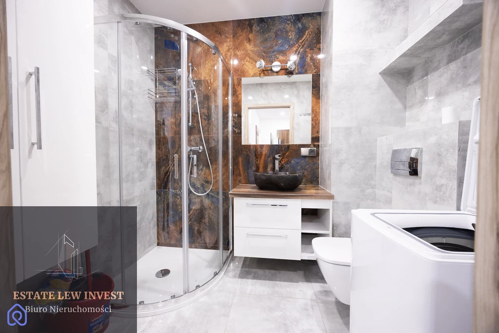 Kabina prysznicowa, pralka, umywalka z szafką, WC