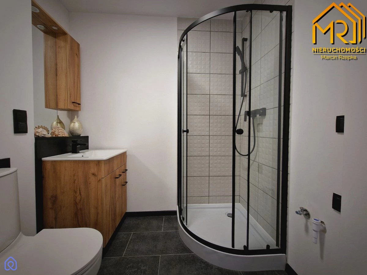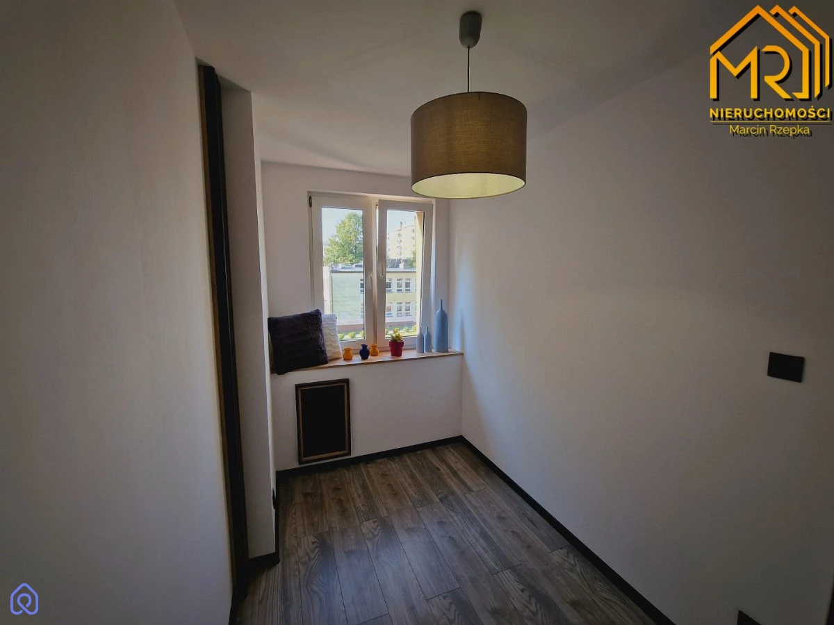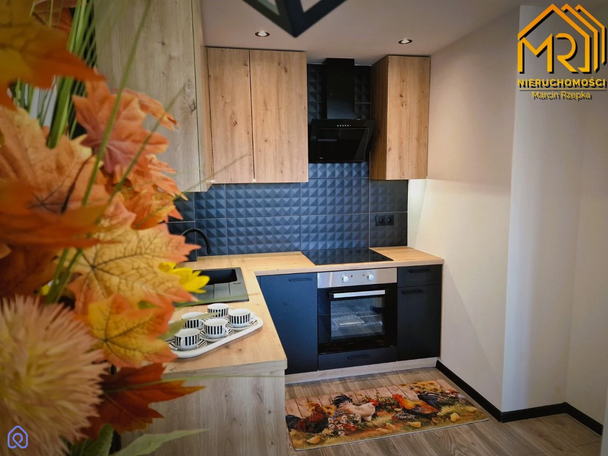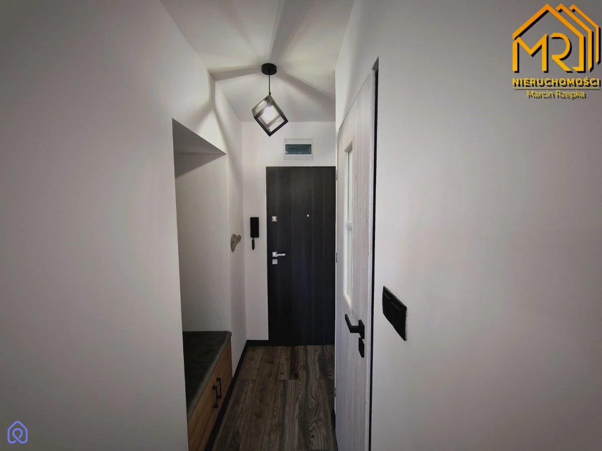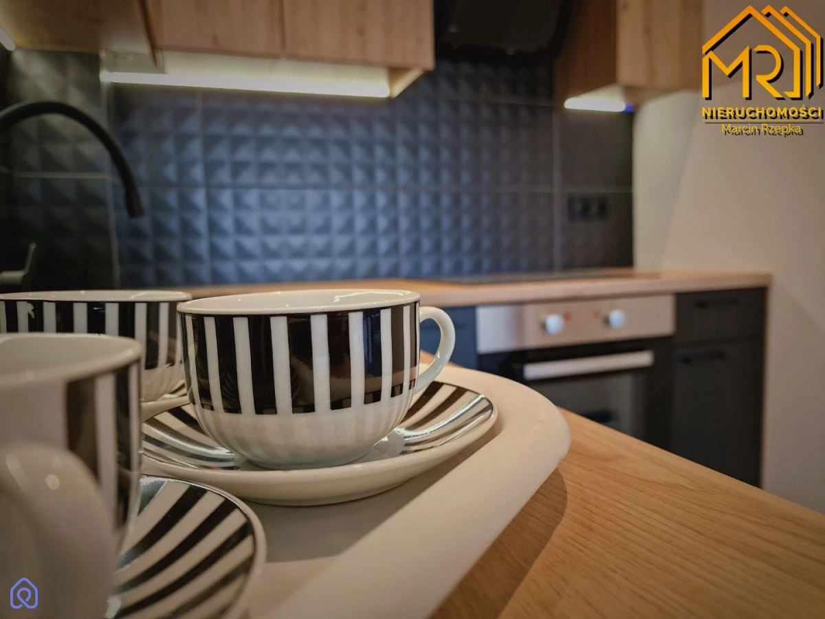 Kuchnia została w pełni zabudowana meblami wykonanymi na wymiar, a sprzęt AGD, taki jak okap, płyta ceramiczna i piekarnik, jest wkomponowany w zabudowę, salon przeznaczony do własnej aranżacji. W sypialni mieści się szafa w zabudowie. W łazience znajduje się prysznic i toaleta, natomiast w przedpokoju zaprojektowano szafkę na buty oraz wieszak. Dodatkowo wymieniono wszystkie drzwi, zarówno wewnętrzne, jak i zewnętrzne oraz stolarkę okienną.