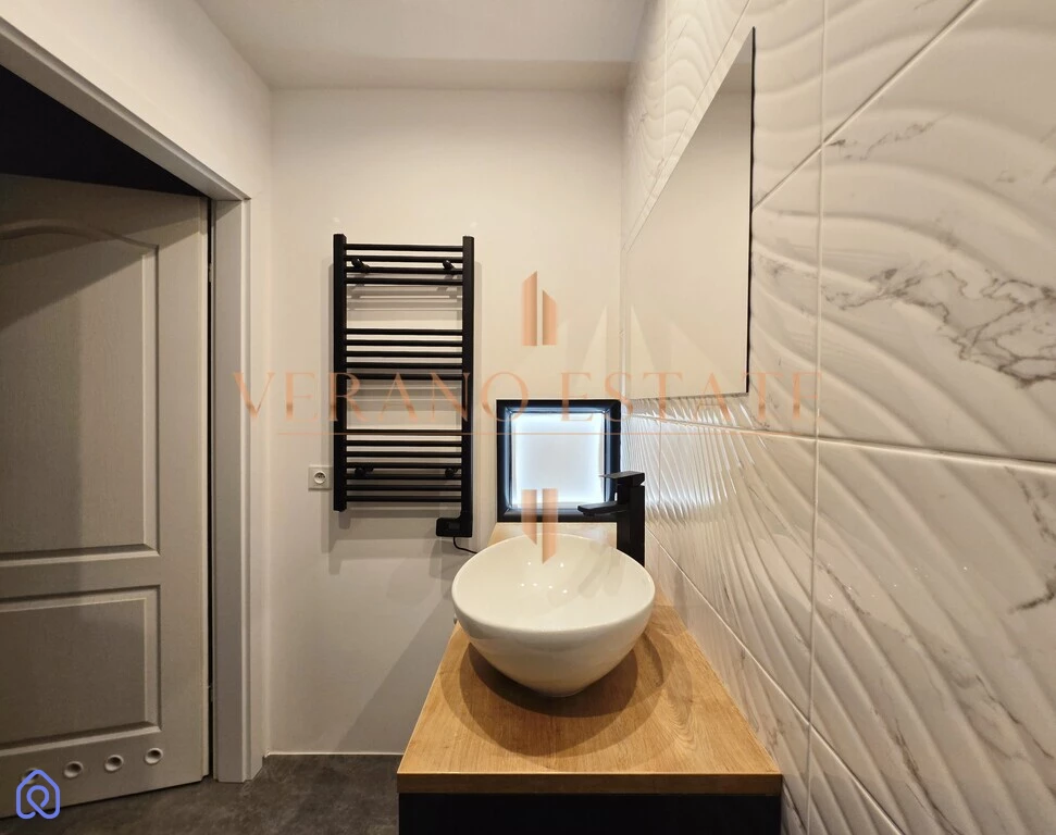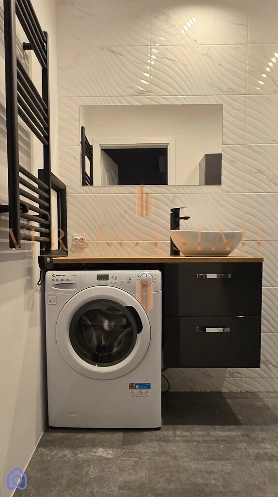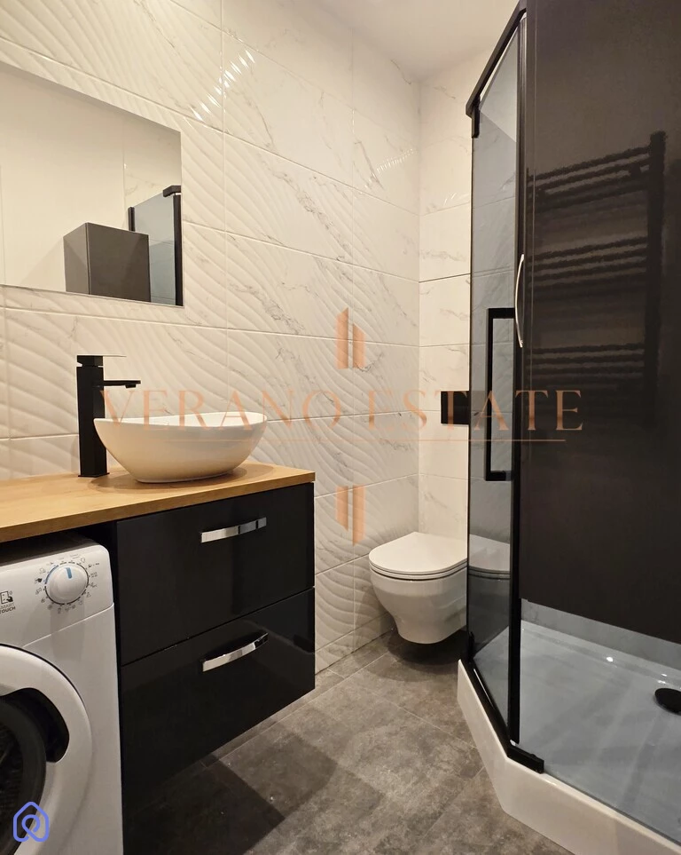 - Wnętrze wykończone w jasnych barwach, z nowoczesnym oświetleniem i estetyczną łazienką