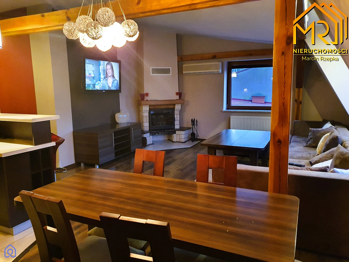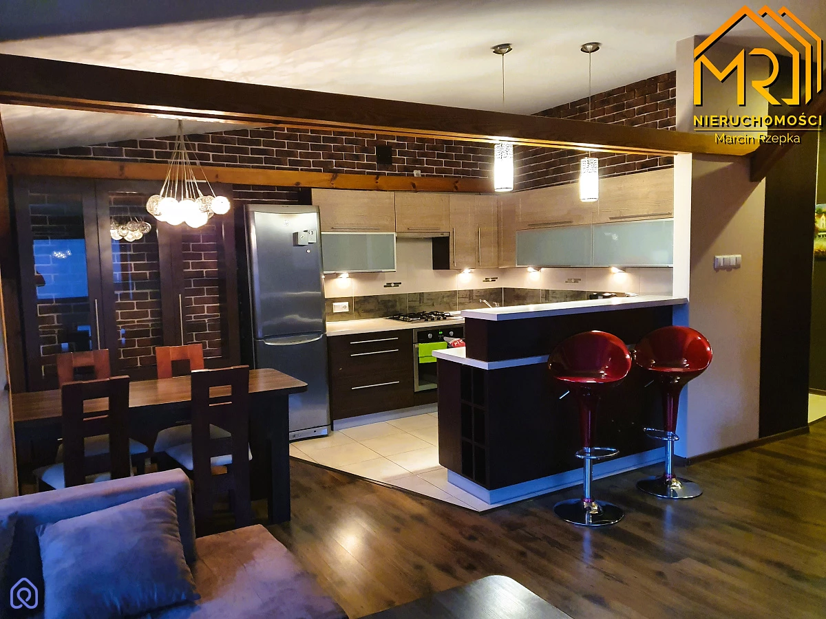 W centralnej części mieszkania znajduje się przestronne wnętrze czyli duży salon, który został urządzony z dbałością o klimat. W salonie znajduje się wygodna duża kanapa oraz kominek, który dodaje wnętrzu niepowtarzalnego uroku. Salon łączy się z aneksem kuchennym, wyposażonym w praktyczną półwyspę oraz sprzęt AGD, w tym lodówkę, piekarnik i kuchenkę gazową. To idealne miejsce do wspólnych spotkań z rodziną i przyjaciółmi.