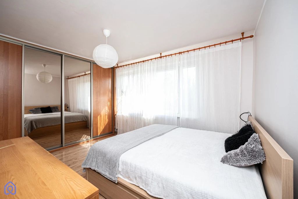 Sypialnia o powierzchni 15,6 m2 jest wyposażona w duże lóżko z nowym materacem oraz olbrzymią szafę w zabudowie.