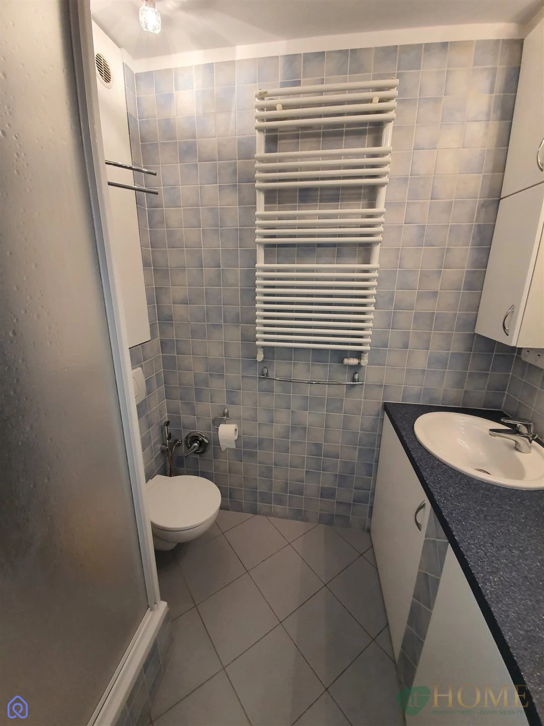 Łazienka razem z toaletą i pralką. Nowoczesna i zadbana.