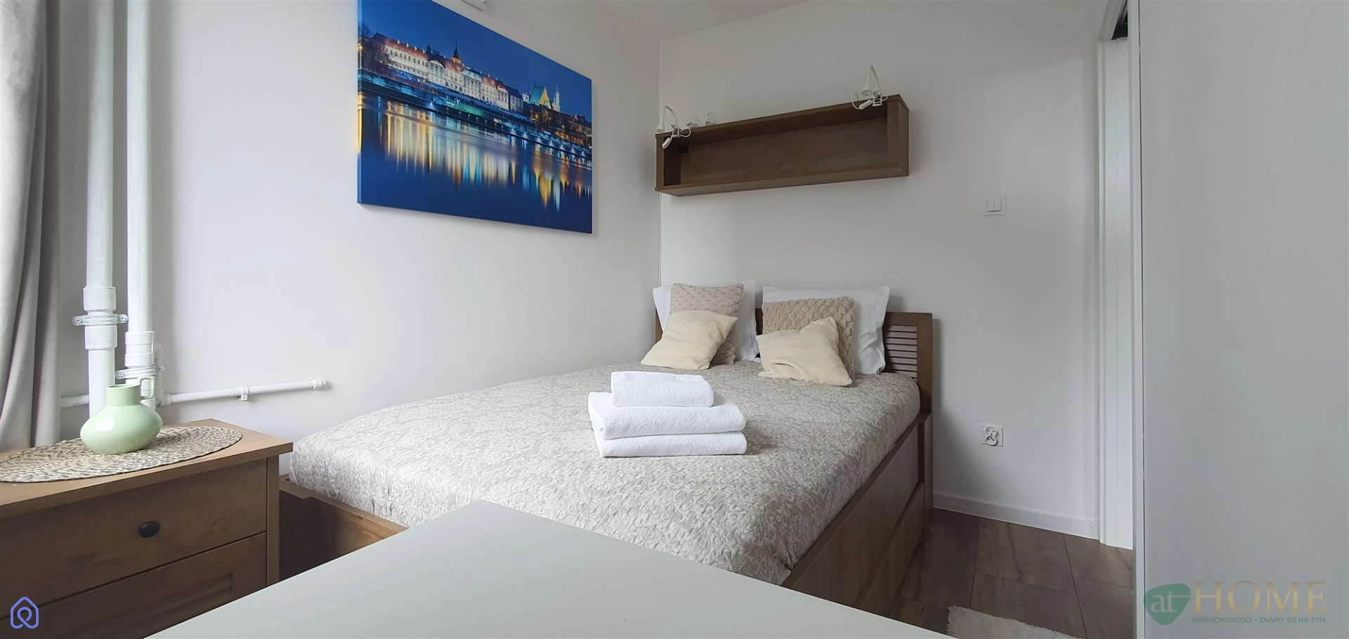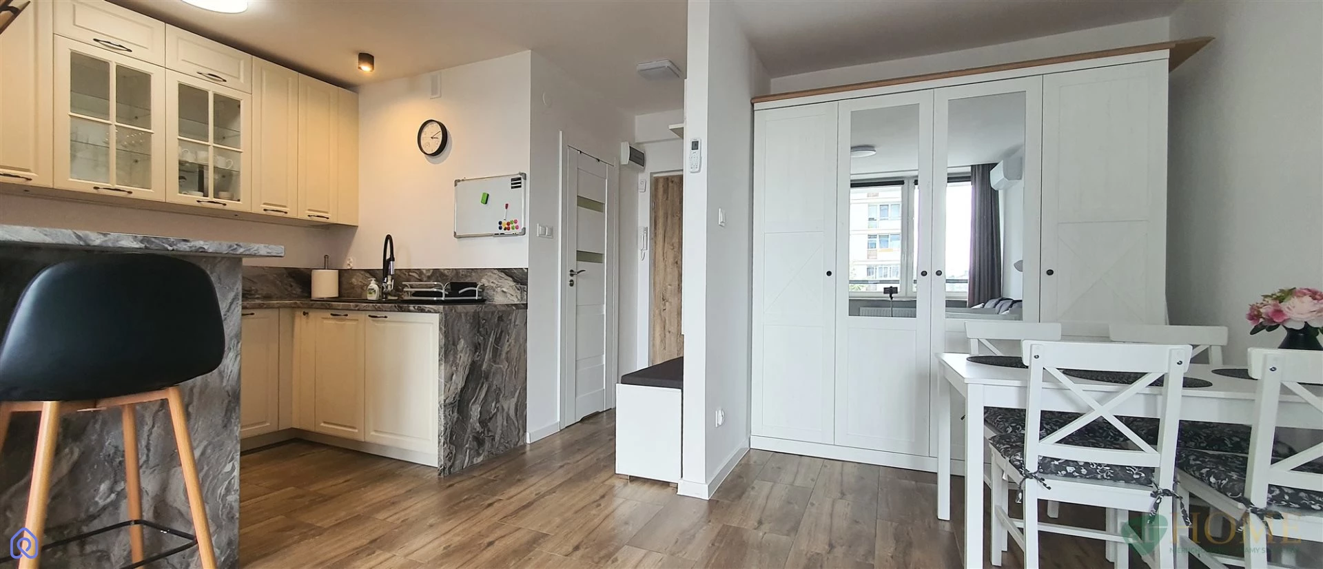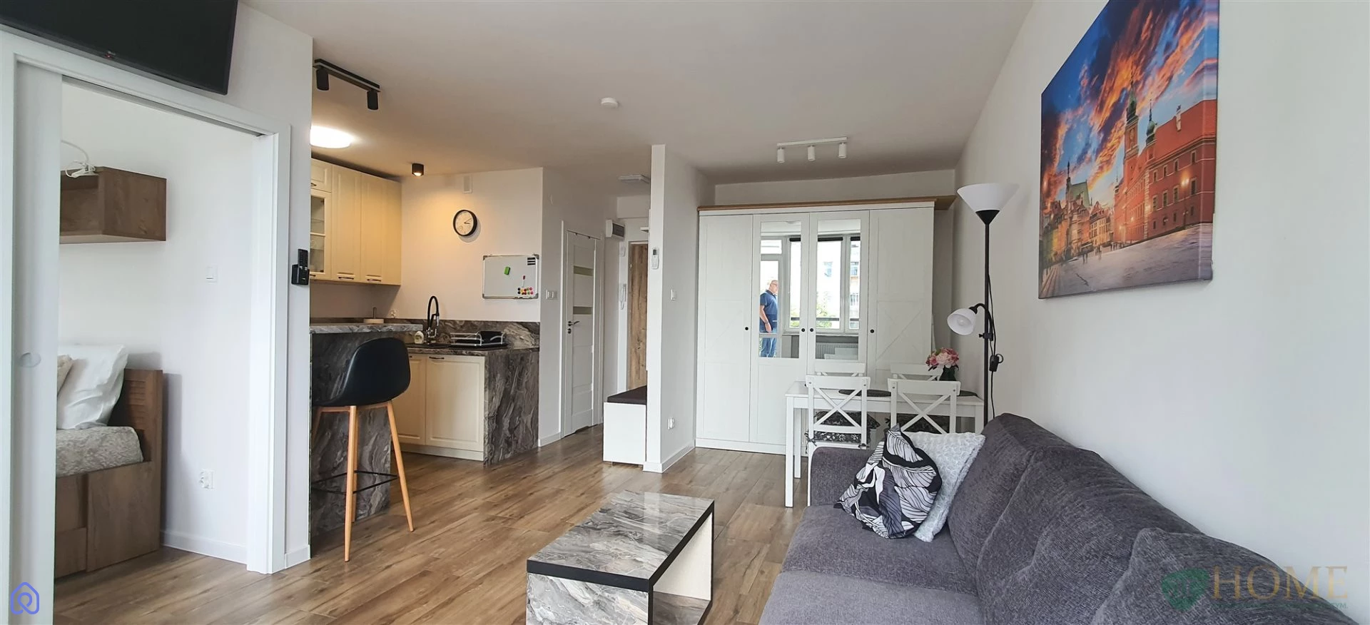 salon z kuchnią otwartą, w pełni umeblowaną i wyposażoną w sprzęt AGD, sypialnia z wygodnym łóżkiem, elegancka łazienka z kabiną prysznicową, mieszkanie świeżo wykończone, jasne i funkcjonalne.