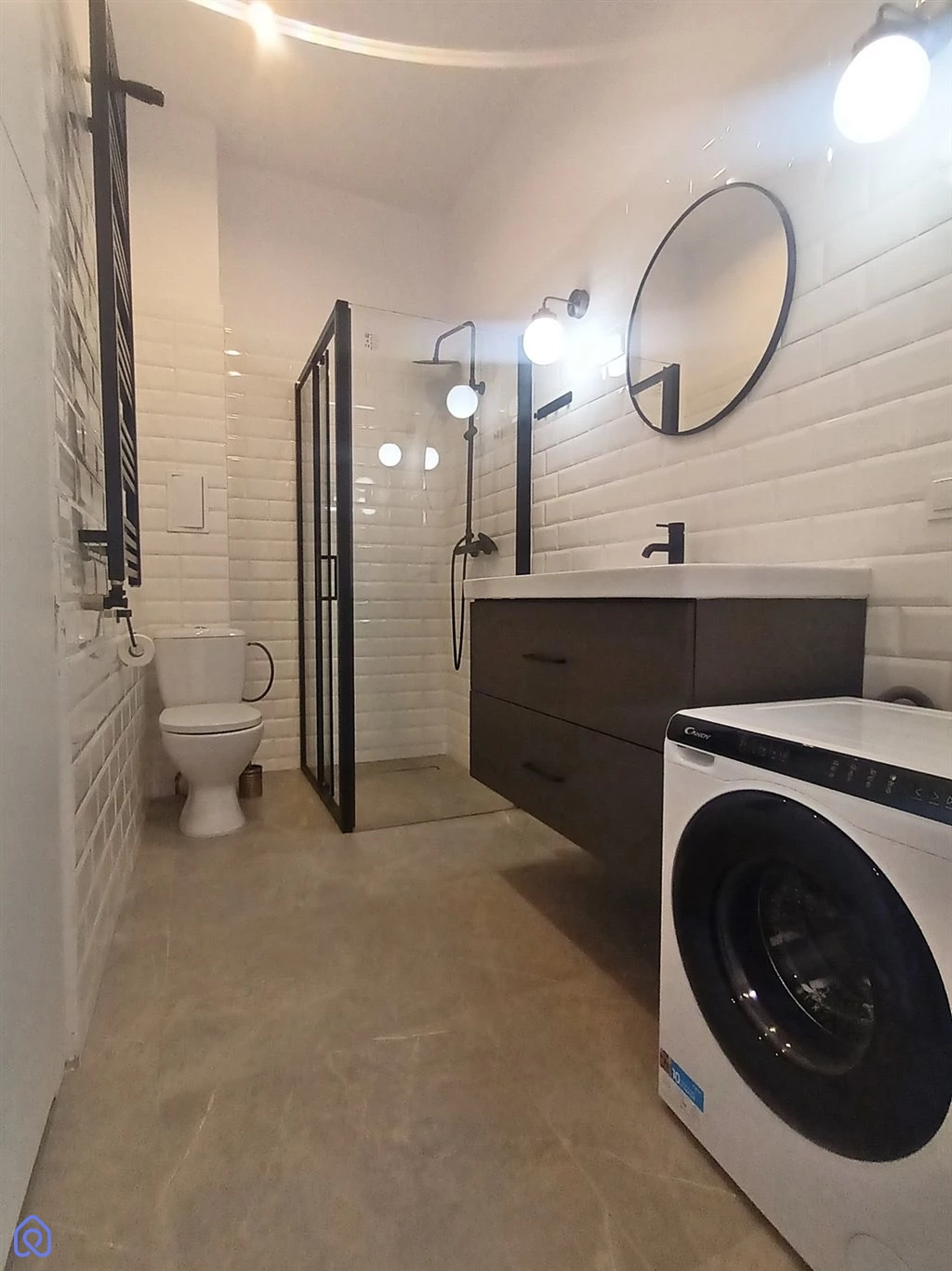 Mieszkanie składa się z salonu z aneksem kuchennym oraz dwóch samodzielnych pokoi , dużej łazienki z kabiną prysznicową i szafkami do przechowywania . pralka.