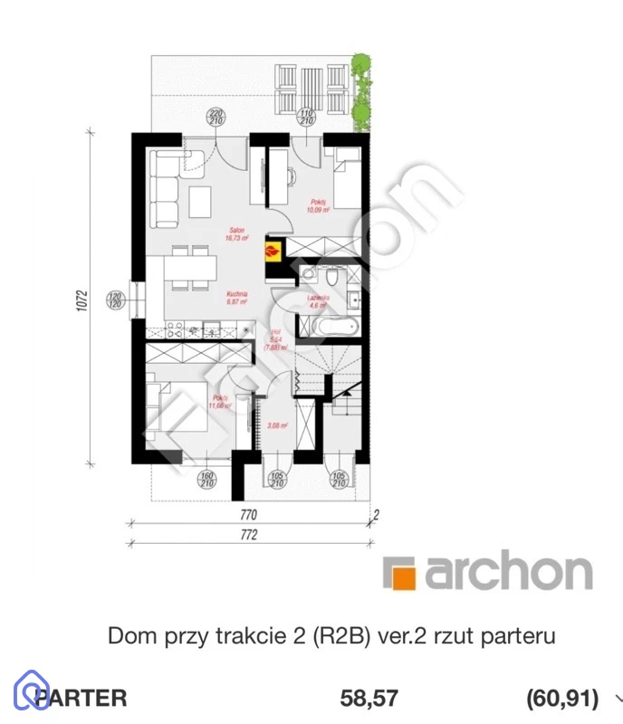 Lokal mieszkalny o powierzchni użytkowej 60,52 m2, położony na parterze budynku, składa się z salonu z aneksem kuchennym i wyjściem do ogrodu, dwóch pokoi, łazienki z WC oraz przedpokoju.