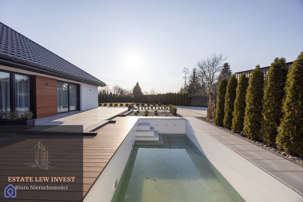 Wyjdź na zewnątrz i zanurz się w pięknie starannie zaprojektowanego ogrodu. Bujna roślinność (sosny, świerki, cisy, trawy ozdobne, hortensje, panele z bluszczu) tworzy oazę spokoju i prywatności. Całoroczny basen o wymiarach 3 x 7 m z podgrzewaczem wody (zasilany prądem z instalacji fotowoltaicznej) i przyległym pomieszczeniem technicznym to idealne miejsce na relaks i zabawę.