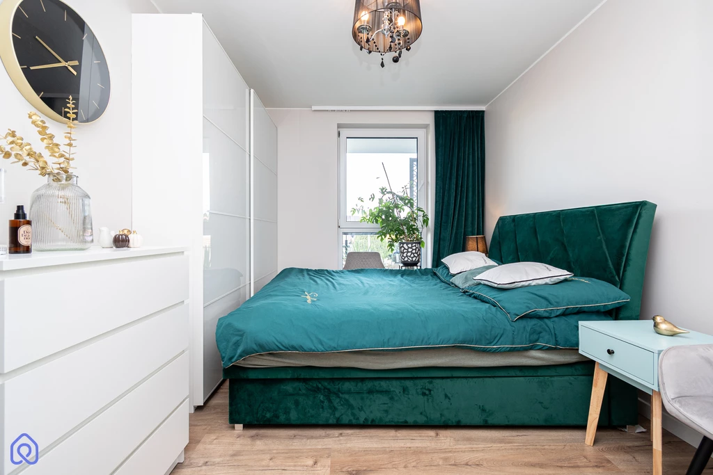 • jasna i ustawna sypialnia z miejscem na duże łóżko i szafę,
