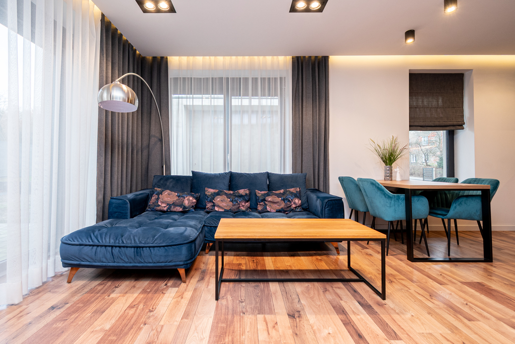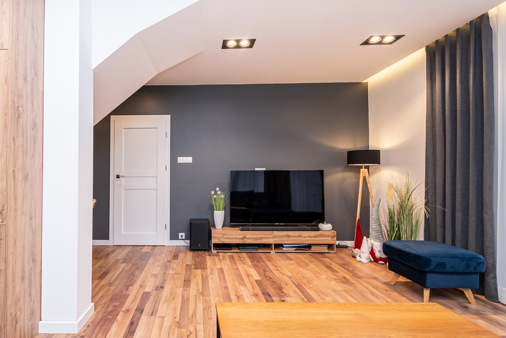 przestronny salon z aneksem kuchennym o powierzchni ok. 29 m² – idealne miejsce do codziennego życia i spotkań rodzinnych,