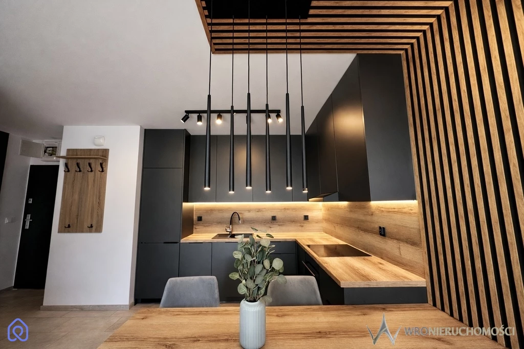 duże szafy, zabudowy w kuchni, łazience i przedpokoju kuchnia: lodówka z zamrażarką, zmywarka, indukcja, piekarnik z funkcją mikrofalówki + pełne wyposażenie