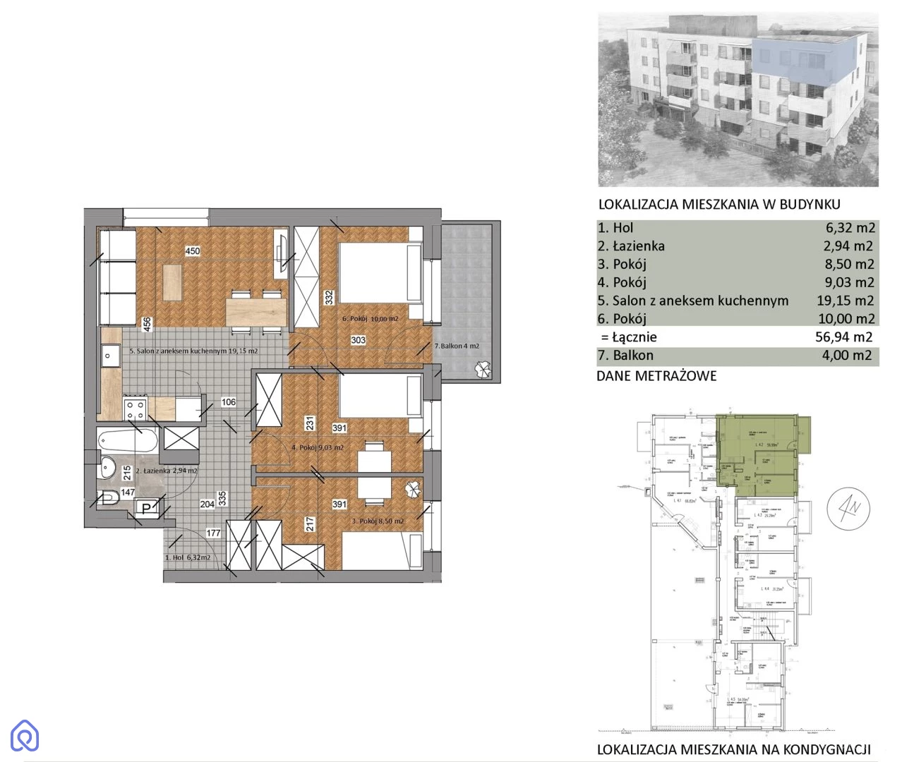 Powierzchnia mieszkania to 56,94m2, na którą składają się: