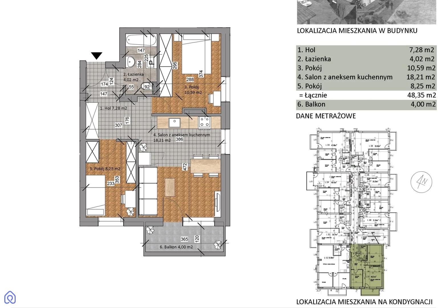 salon z aneksem kuchennym 18,21m2 dwie sypialnie (10,59m2 i 8,25m2) łazienka z wc 4,02m2 przedpokój 7,28m2 dodatkową powierzchnią jest balkon 4m2