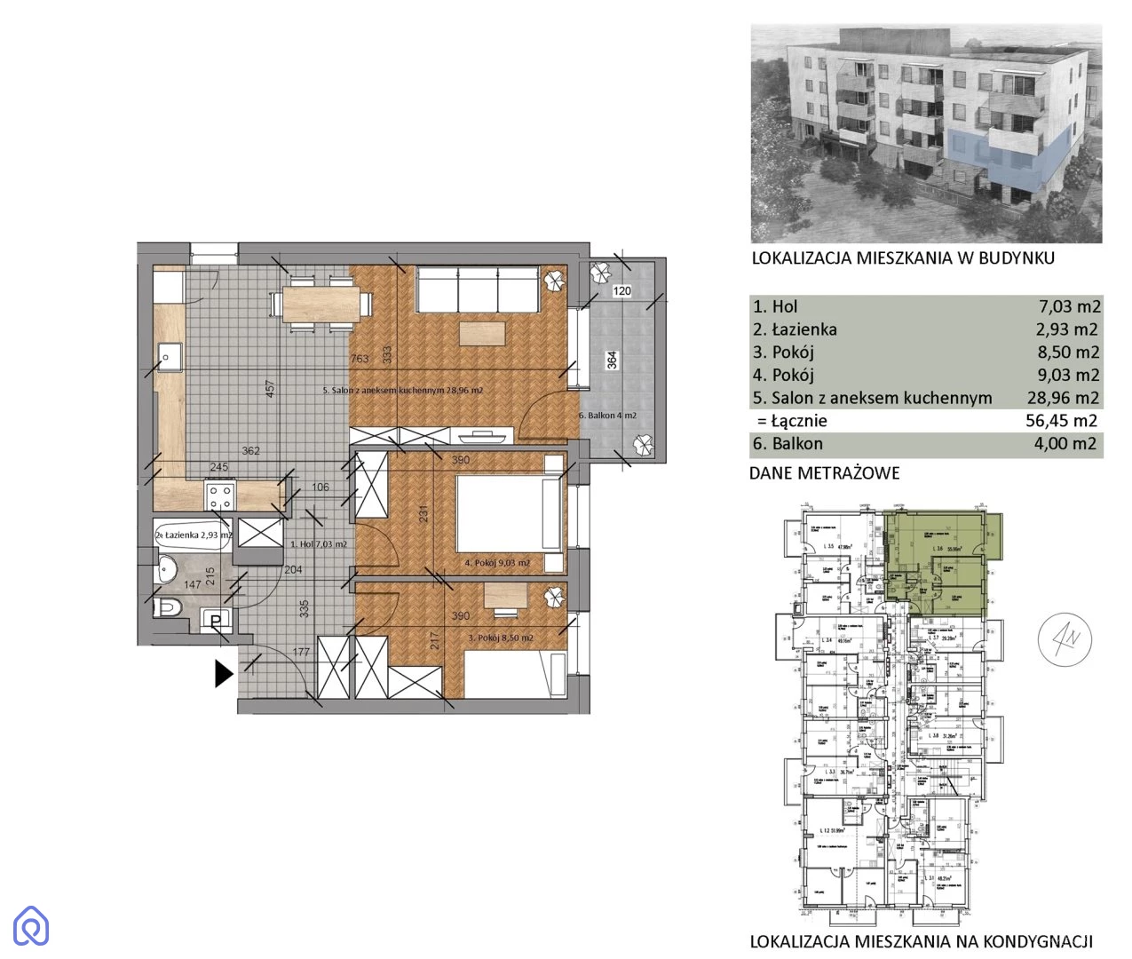 salon z aneksem kuchennym 28,96m2 dwie sypialnie (9,03m2 i 8,50m2) łazienka z wc 2,93m2 przedpokój 7,03m2 dodatkową powierzchnią jest balkon 4m2