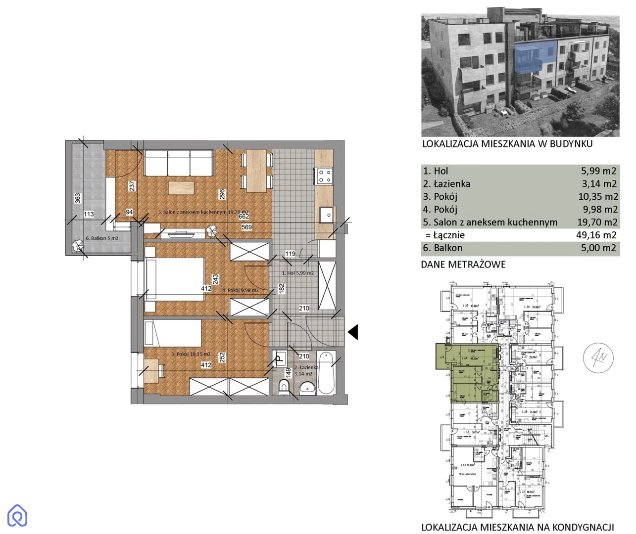 salon z aneksem kuchennym 19,70m2 dwie sypialnie (10,35m2 i 9,98m2) łazienka z wc 3,14m2 przedpokój 5,99m2 dodatkową powierzchnią jest balkon 5m2
