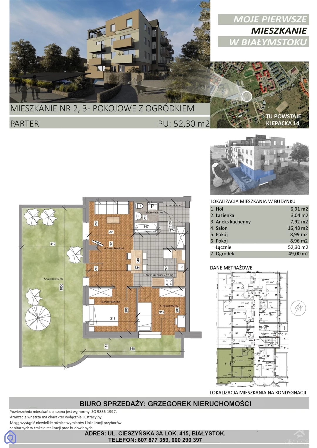 salon 16,48m2 aneks kuchenny 7,92m2 dwie sypialnie (8,96m2 i 8,99m2) łazienka z wc 3,04m2 przedpokój 6,91m2 dodatkową powierzchnią jest ogródek 49m2
