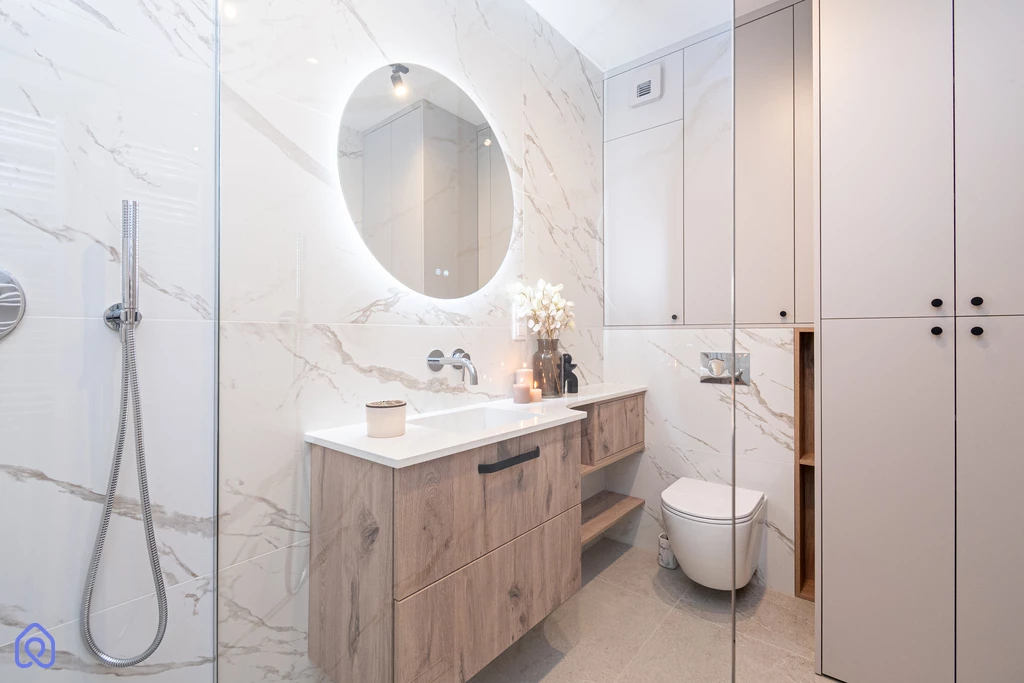 -Elegancka łazienka – prysznic typu walk-in i blat z naturalnego kamienia