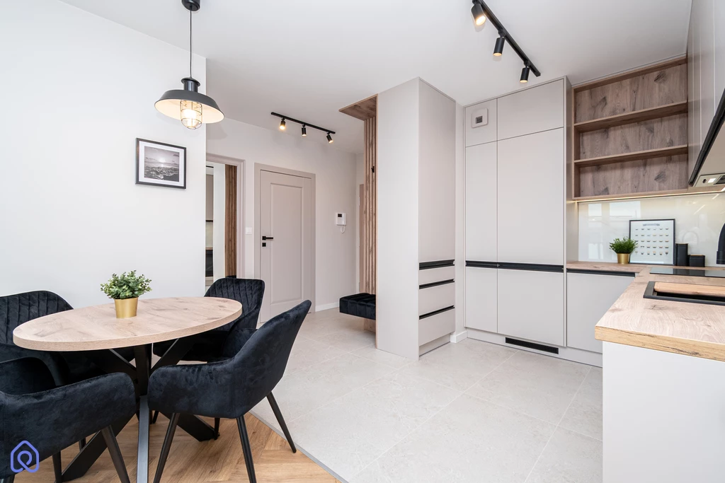 -Przestronny salon z aneksem kuchennym –doskonale dobrane dodatki i oświetlenie, stylowa zabudowa w modnym odcieniu kaszmiru oraz wysokiej klasy sprzęt Whirlpool.