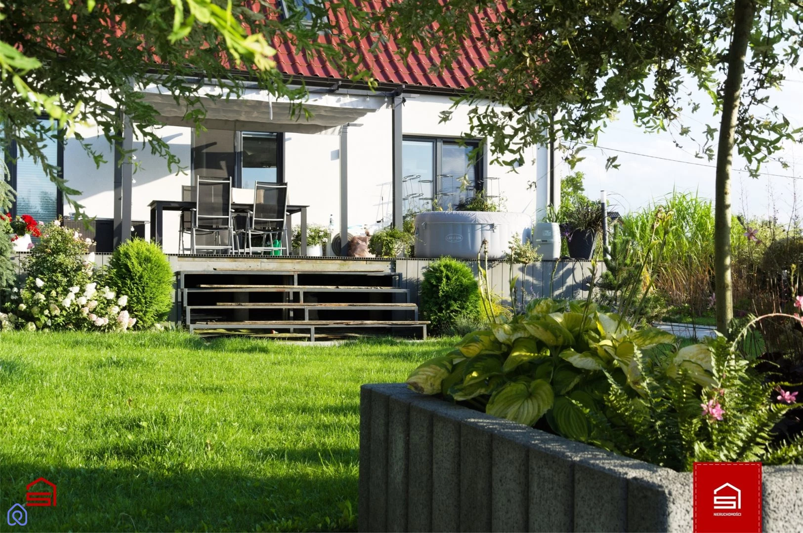 Ogrodowa Przestrzeń: Działka o powierzchni 428 m² została w pełni zagospodarowana. Duży taras jest doskonałym miejscem do spędzania czasu na świeżym powietrzu oraz organizowania grillowania. W ogrodzie znajdziemy szereg dogodnych rozwiązań: zainstalowany w nim jest system nawadniający, oświetlenie zewnętrzne oraz gniazda elektryczne.