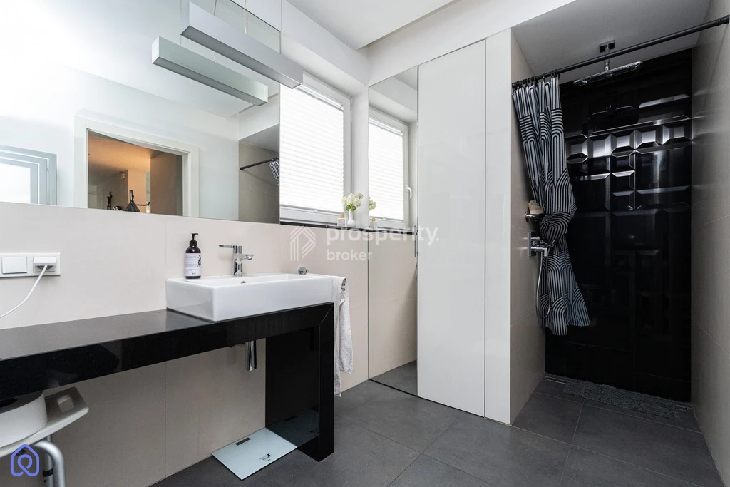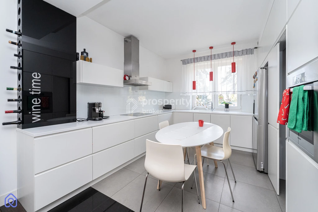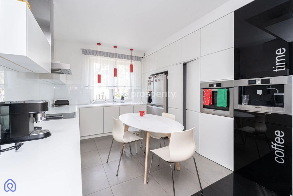 - całkowicie wyposażona, umeblowana kuchnia (dwudrzwiowa lodówka, płyta indukcyjna, piekarnik elektryczny, zmywarka, ekspres w zabudowie)