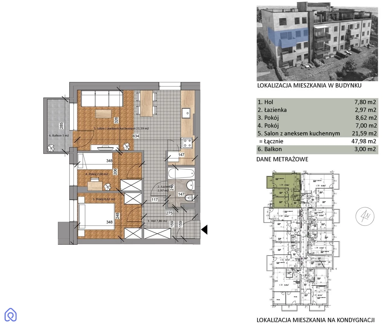 Powierzchnia mieszkania to 47,98m2, na którą składają się:salon z aneksem kuchennym 21,59m2dwie sypialnie (8,62m2 i 7,00m2)łazienka z wc 2,97m2przedpokój 7,80m2dodatkową powierzchnią jest balkon 3m2DODATKOWE INFORMACJE:nieruchomość wykończona w wysokim standardzie, w modnej i nowoczesnej kolorystyce.