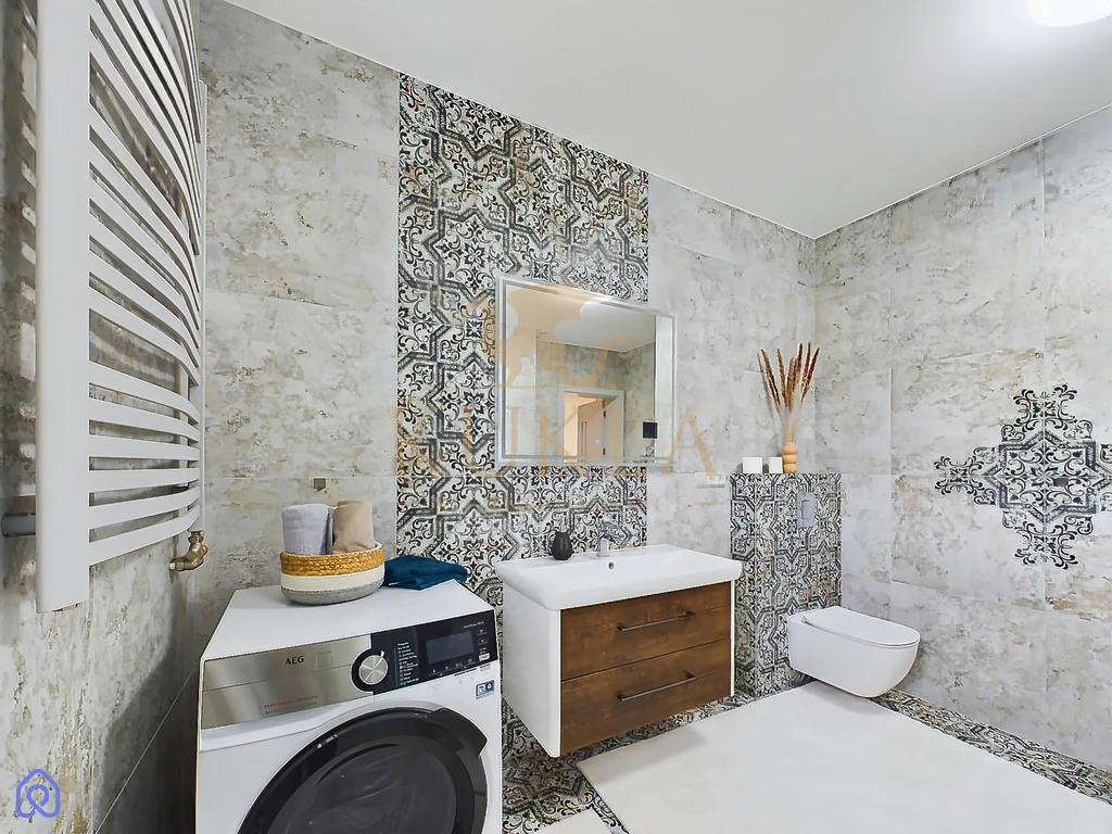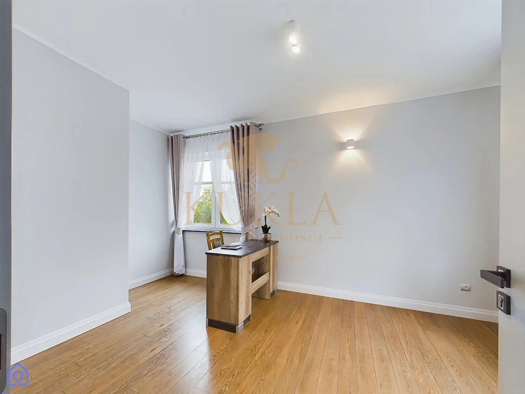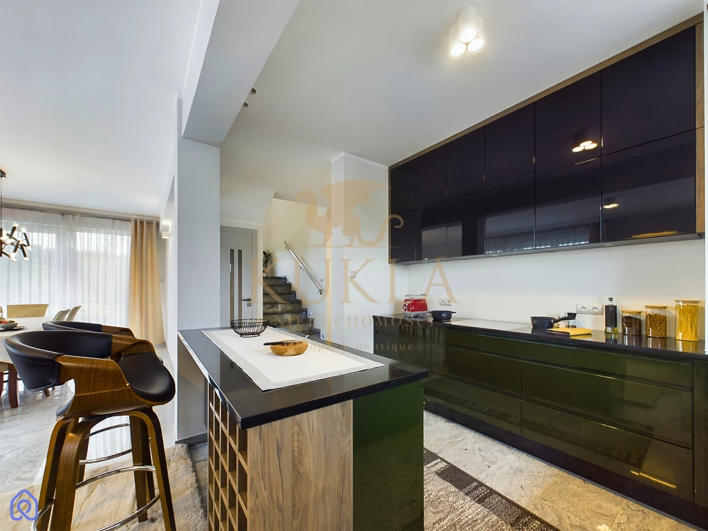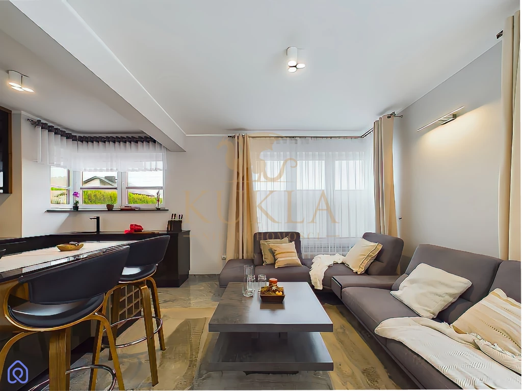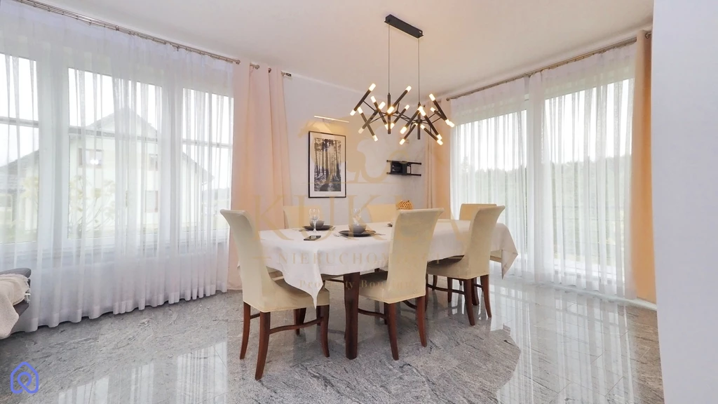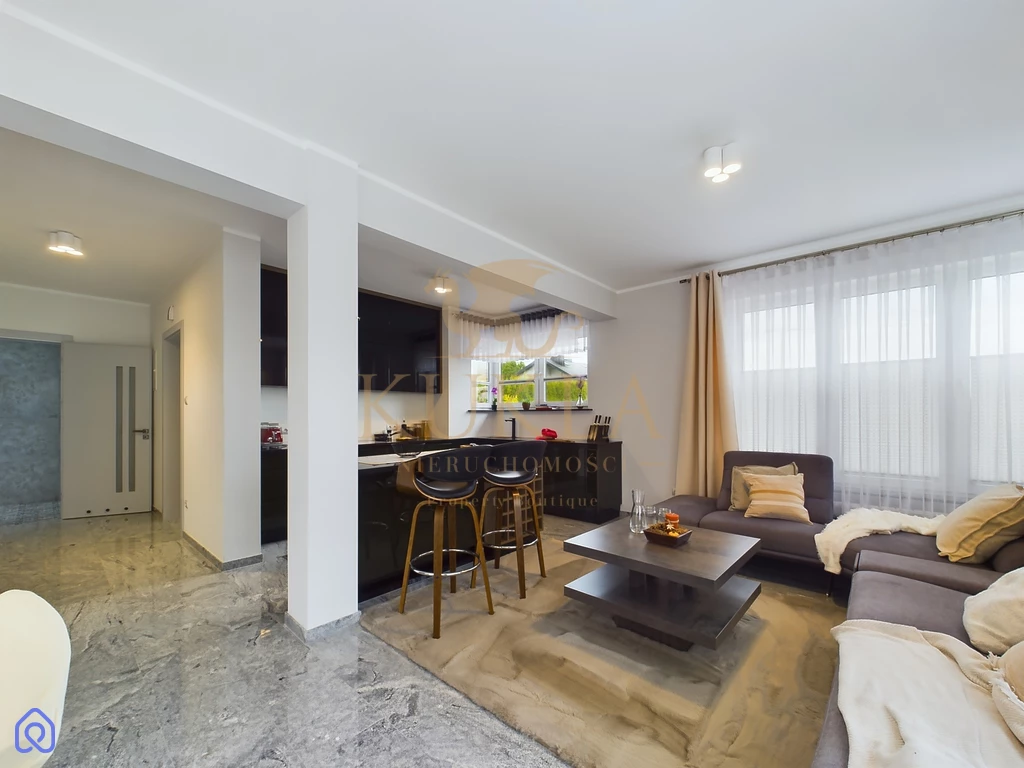 Dom został wykonany w wysokim standardzie i zapewnia wygodę dzięki nowoczesnym rozwiązaniom technologicznym. Ogrzewanie gazowe z piecem dwufunkcyjnym, sieć wodociągowa oraz kanalizacyjna, a także monitoring na zewnątrz budynku gwarantują bezpieczeństwo i komfort mieszkańcom. Wnętrza domu są elegancko wykończone naturalnym kamieniem w wiatrołapie, korytarzu, kuchni, salonie, jadalni oraz na klatce schodowej. Dodatkowym atutem jest pełne umeblowanie domu, w tym niezbędne sprzęty AGD takie jak lodówka, piekarnik, płyta gazowa/elektryczna, zmywarka oraz pralka.