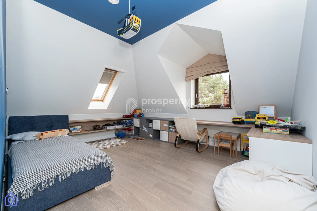 - Na piętrze: sypialnia master z garderobą, 2 pokoje, 2 łazienki (w jednej sauna fińska).