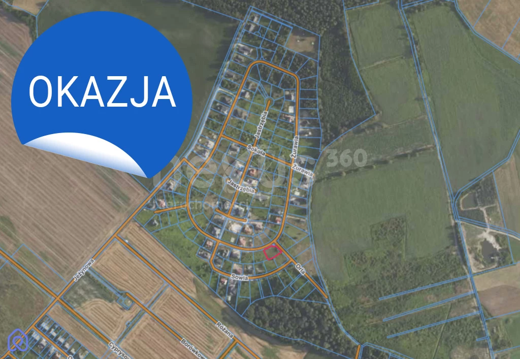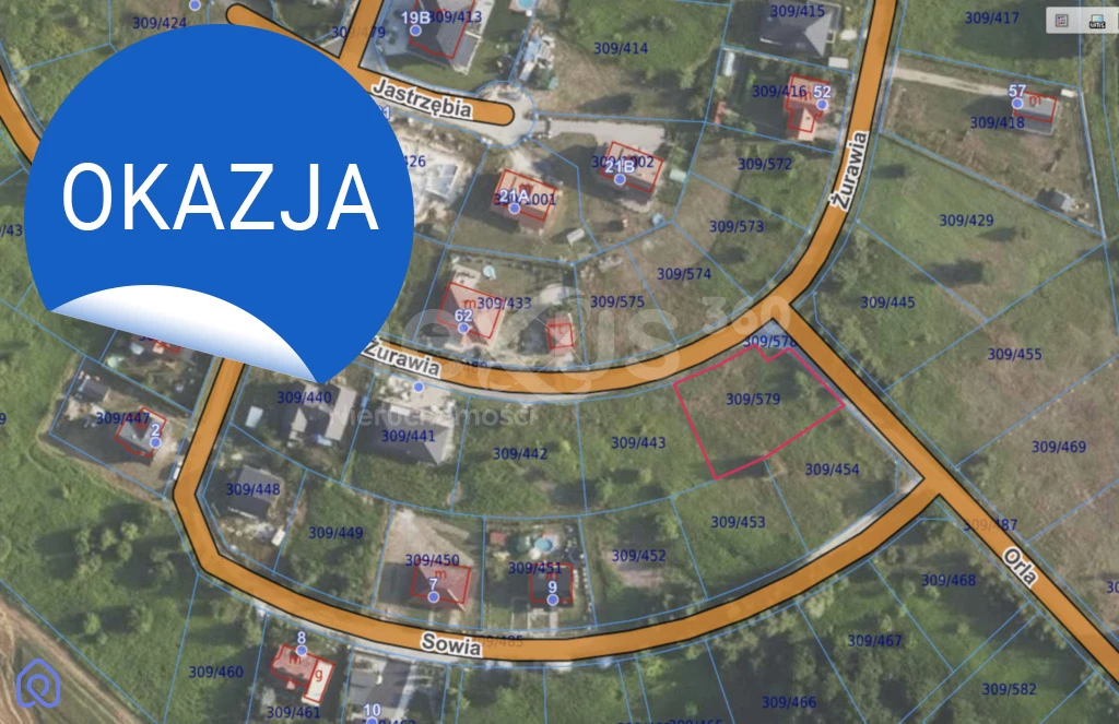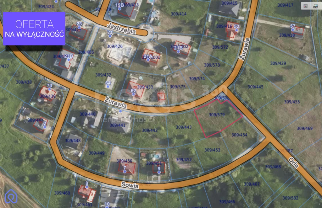 Oferowana działka jest o powierzchni 939 m² (nr 309/579), zlokalizowana przy zbiegu ulic Orlej i Żurawiej na terenie kameralnego osiedla Podkowa Leśna (dojazd drogą asfaltową).