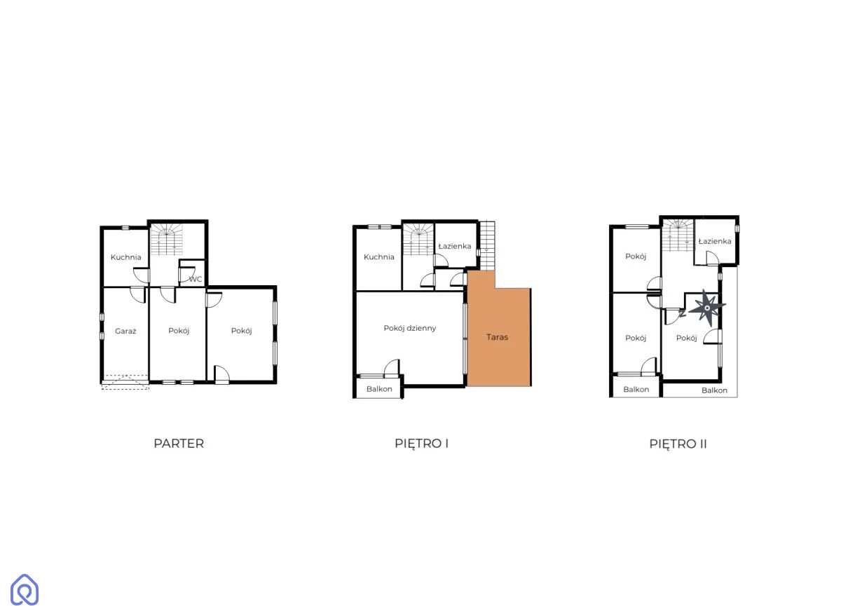 Trzy sypialnie, w tym dwie z wyjściem na balkon, oraz łazienka. Spokojna, wyraźnie oddzielona część domu.