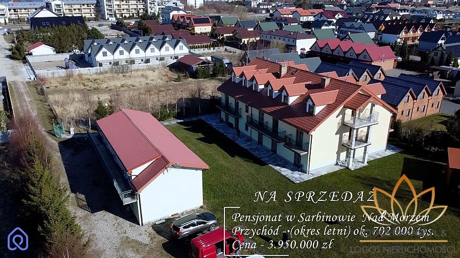 Mamy przyjemność zaprezentowania Pensjonatu nad morzem w miejscowości Sarbinowo. Sarbinowo - urocza wieś nad Bałtykiem, na Wybrzeżu Sowińskim. Położona w województwie zachodniopomorskim, w powiecie koszalińskim, w gminie Mielno, 7 km na zachód od Mielna i 17 km na północny zachód od Koszalina. Miejscowość spokojna, mimo turystów w okresie letnim. Z rozbudowaną infrastrukturą. Ścieżka rowerowa wzdłuż pasa nadmorskiego, rozległe lasy, ruchome wydmy, pyszne jedzenie - to wszystko znajduję się właśnie tu - w Sarbinowie. Pensjonat 400m od morza w którym mieści się 30 pokoi wraz z łazienkami. Do większości pokoi przynależy duży taras. Cały kompleks jest całoroczny, ocieplony i składa się z dwóch budynków, w jednym ( 800m2 ) z nich mieszczą się pokoje wraz z kuchnią oraz mieszkaniem dla właściciela. Natomiast w budynku nr 2 ( 200m2) znajdują się pokoje oraz świetlica z której mogą korzystać goście. Teren zadbany, latem możemy oglądać wysokie kwiaty słonecznika oraz naturalne krajobrazy Bałtyku. 30 miejsc postojowych na terenie działki, całość ogrodzona oraz monitorowana i strzeżona. Budynki ogrzewane są piecem olejowym ( teren idealny pod fotowoltaikę ) Przychód - (okres letni) ok. 702 000 tys. Nieruchomości w chwili obecnej to najlepsza lokata na życie. Dlatego przedstawiamy Państwu długoterminową inwestycję, która zarabia od swoich pierwszych dni w naszych rękach. W naszym biurze rata dla tej nieruchomości już od 23 320,24 zł Cena do negocjacji Zapraszam do oglądania, Paulina Kaliszczak