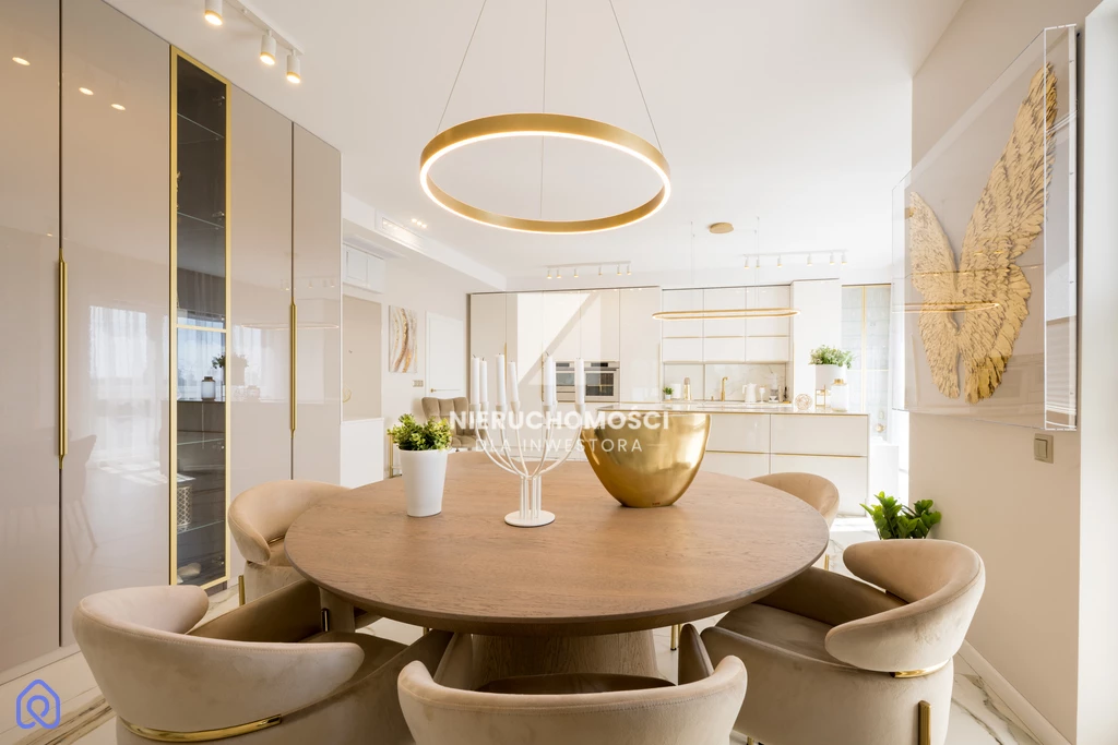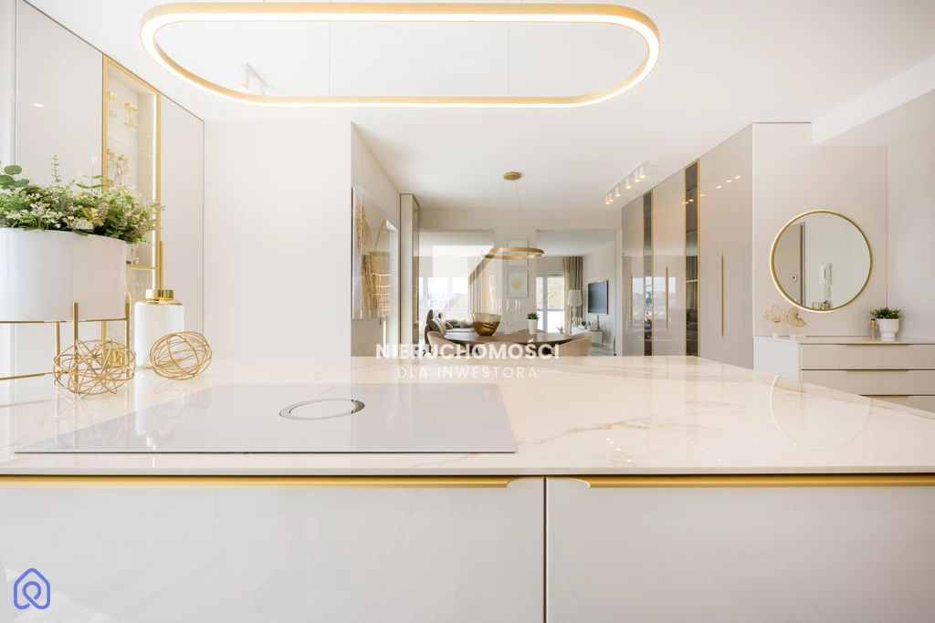 Jasne powierzchnie, złote detale, dopracowane dodatki – wszystko tworzy elegancką, ale nienachalną całość. To mieszkanie nie krzyczy. Ono buduje relację – im dłużej w nim jesteś, tym bardziej je doceniasz.