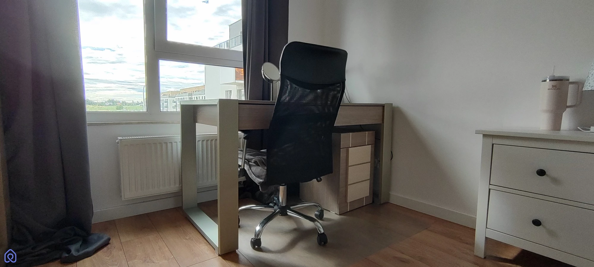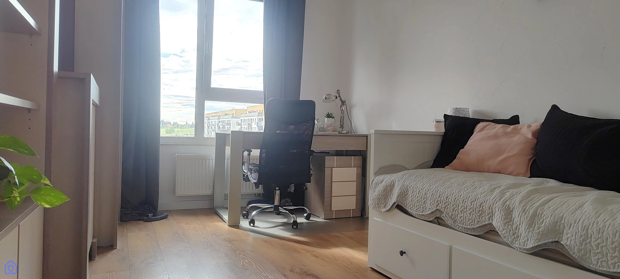 Do wynajęcia pokój 12,81 m² w mieszkaniu 3-pokojowym, na 2. piętrze nowego bloku z windą. Pokój umeblowany (łóżko, biurko, szafa, komoda, szafka nocna), zamykany na klucz.