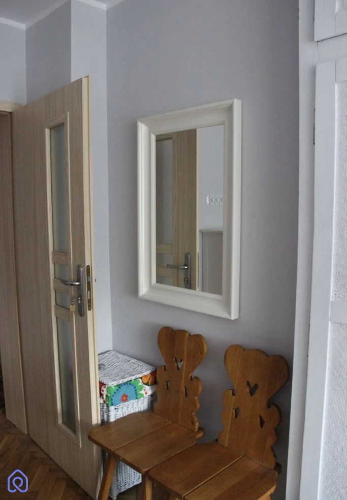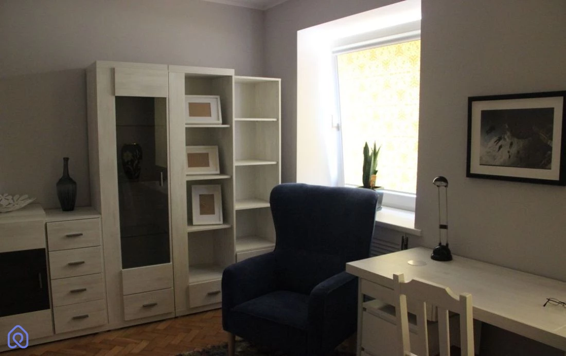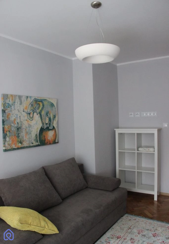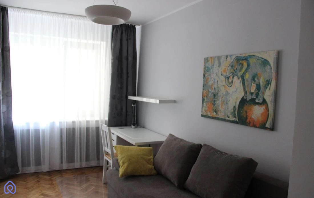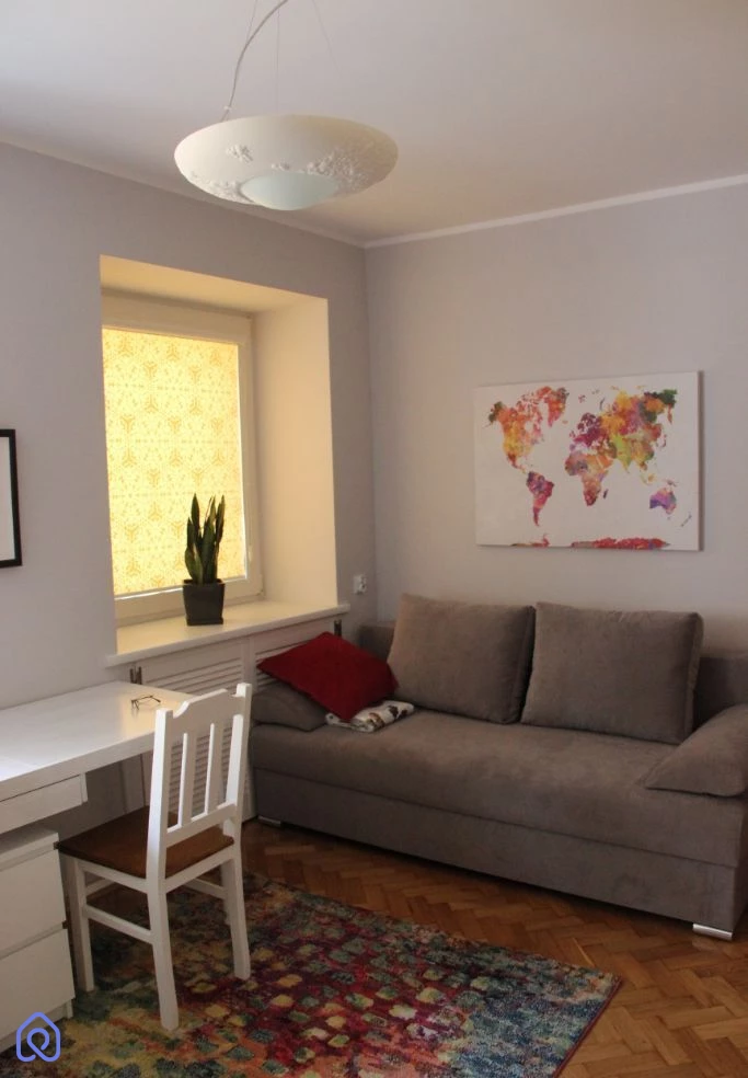 Pokój urządzony z dbałością o detale oferuje regały, rozkładaną kanapę oraz eleganckie dywany, co stwarza atmosferę domowego zacisza. Mieszkanie oraz klatka schodowa utrzymane są w nienagannej czystości dzięki regularnemu sprzątaniu.