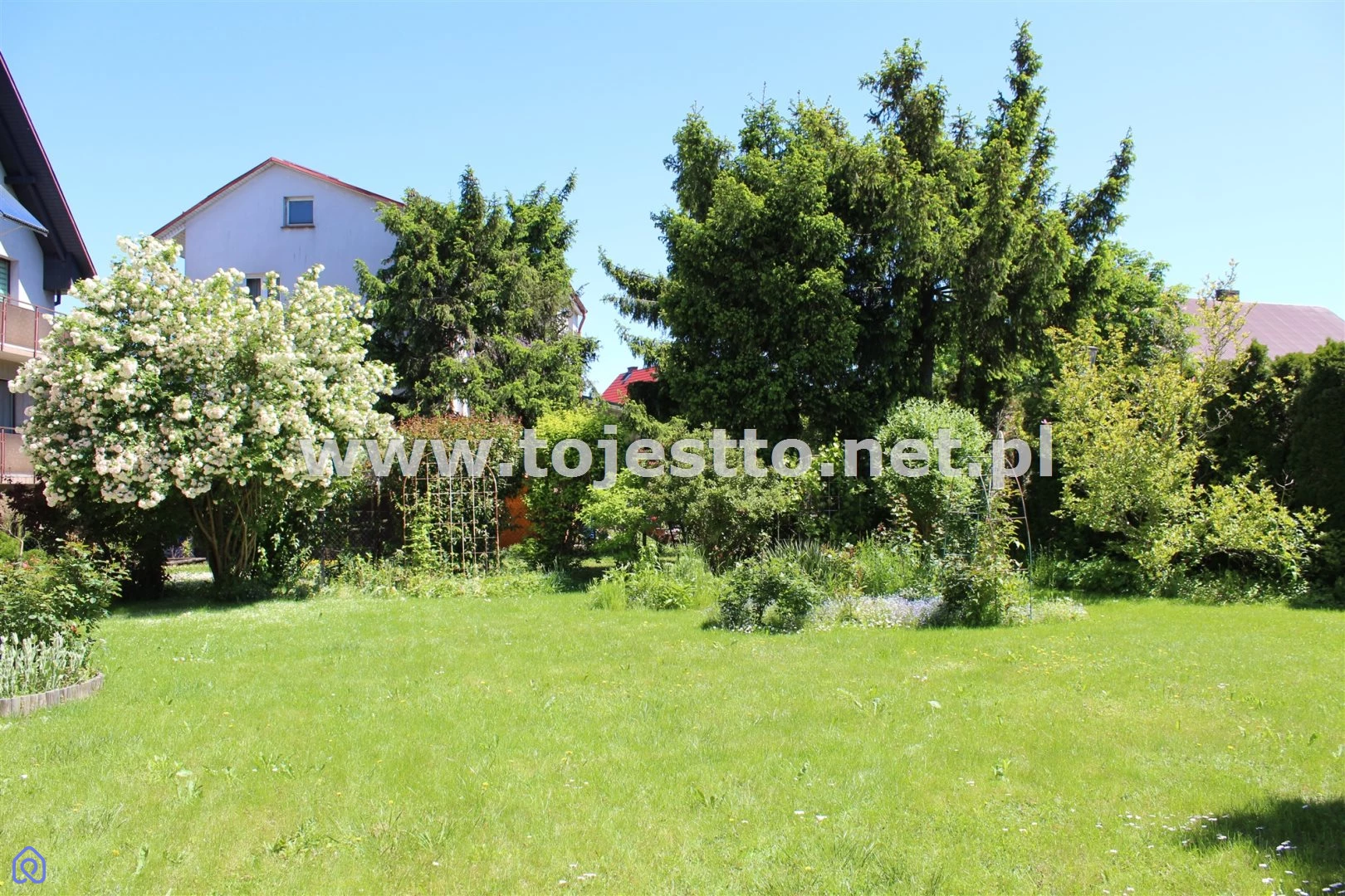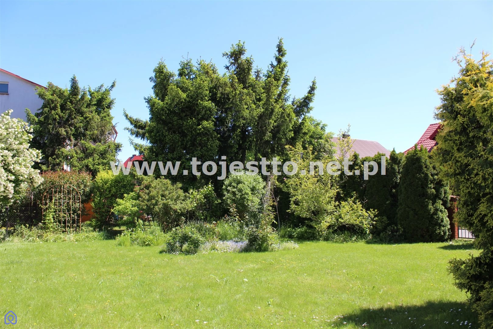 Działka domu: powierzchnia 428m2, w kształcie wydłużonego prostokąta, teren działki płaski, działka zadbana, w całości ogrodzona, obsadzona roślinami iglastymi i krzewami i drzewami liściastymi.