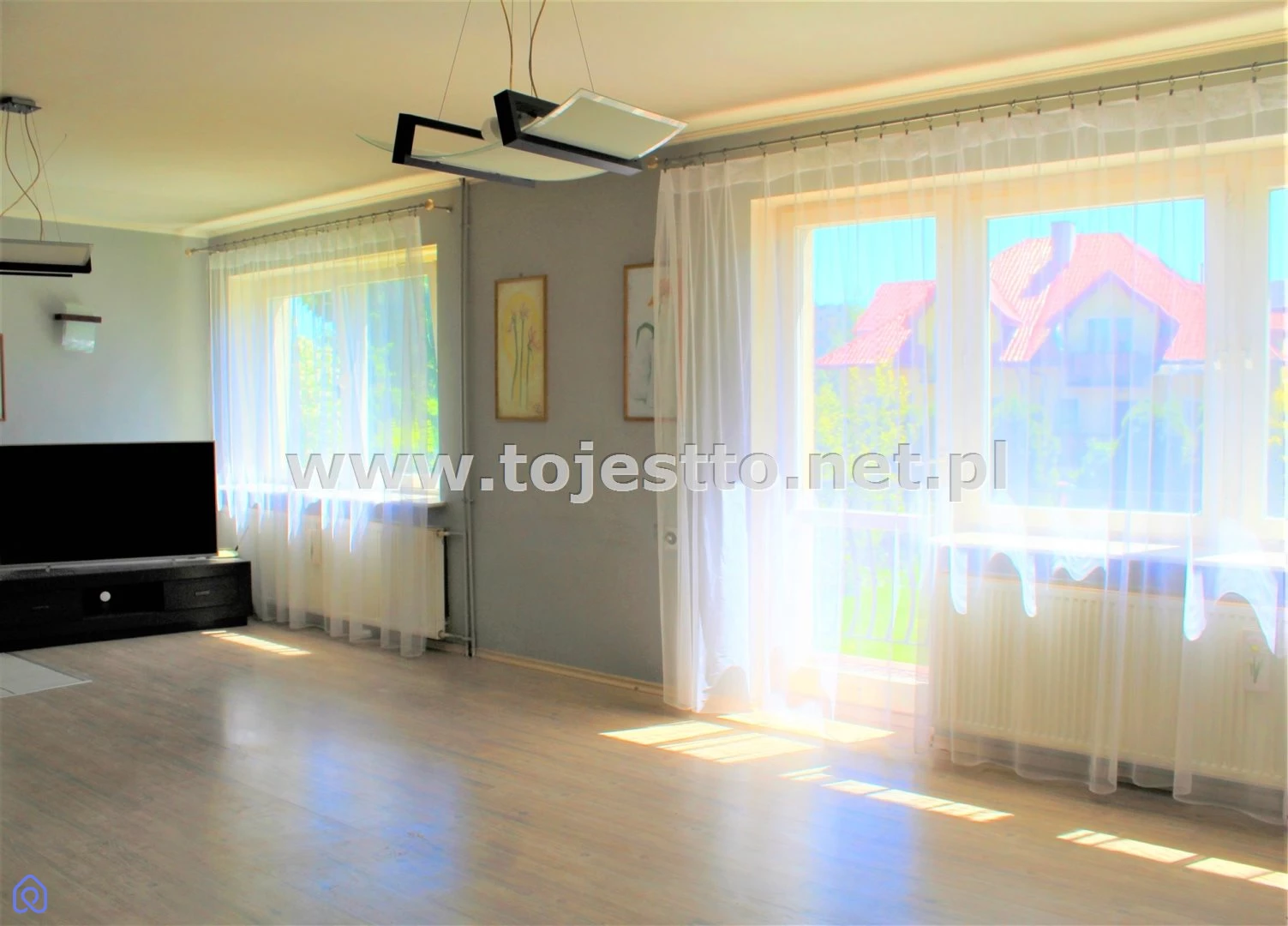 przestronny jasny salon powierzchnia około 36m2, w salonie podwójne okna i drzwi balkonowe, na podłodze panele