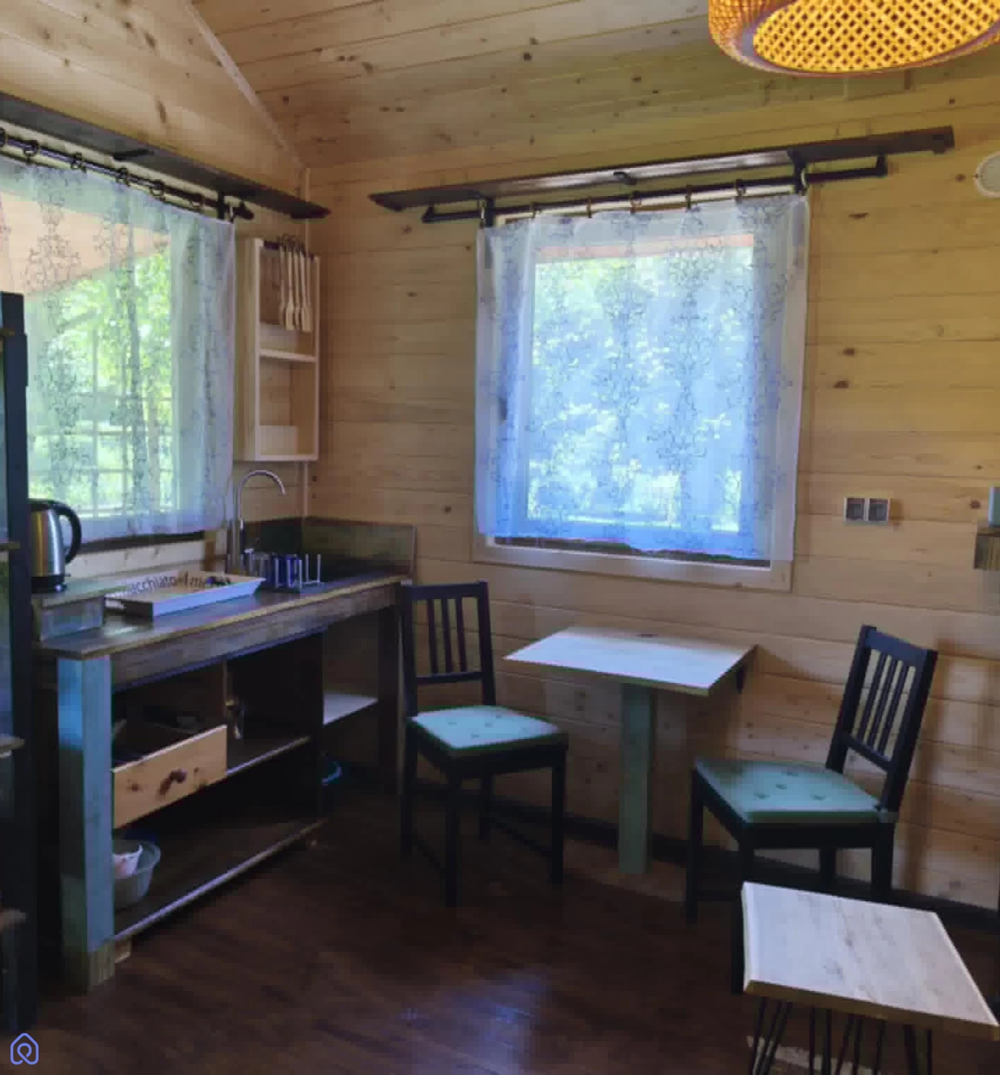 – Wyposażony w toaletę, okna z moskitierami, stół oraz aneks kuchenny Dodatkowo: Zadaszony taras – idealny na poranną kawę lub wieczorny relaks