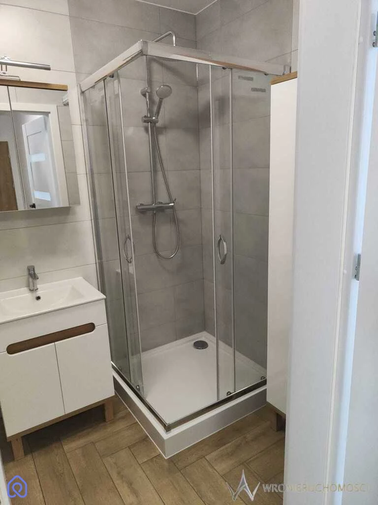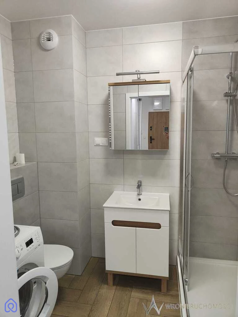 Łazienka wyposażona jest w pralkę, kabinę prysznicową oraz WC.