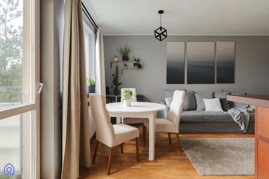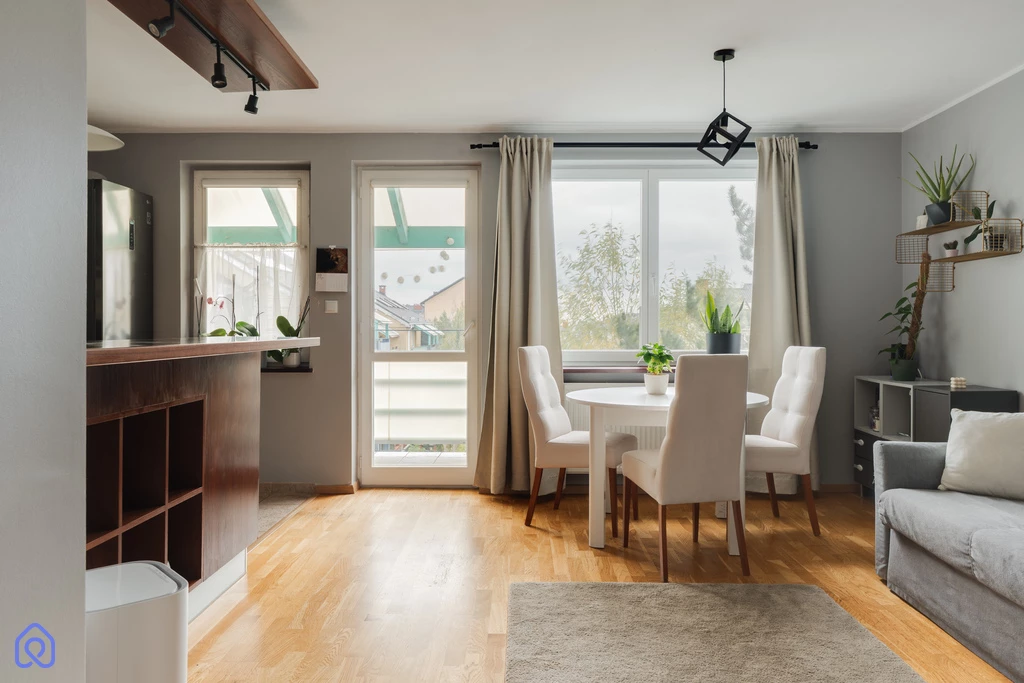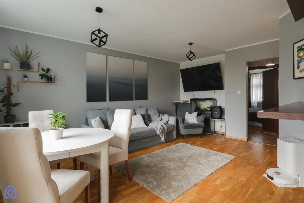 - Przestronny salon z aneksem kuchennym – serce domu, z wyjściem na balkon, idealny na poranną kawę