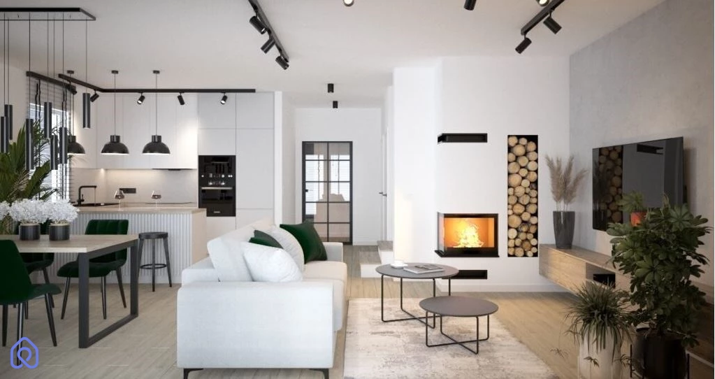 Prosta i tradycyjna bryła, przestronne, jasne wnętrza, salon z kominkiem i tarasem.