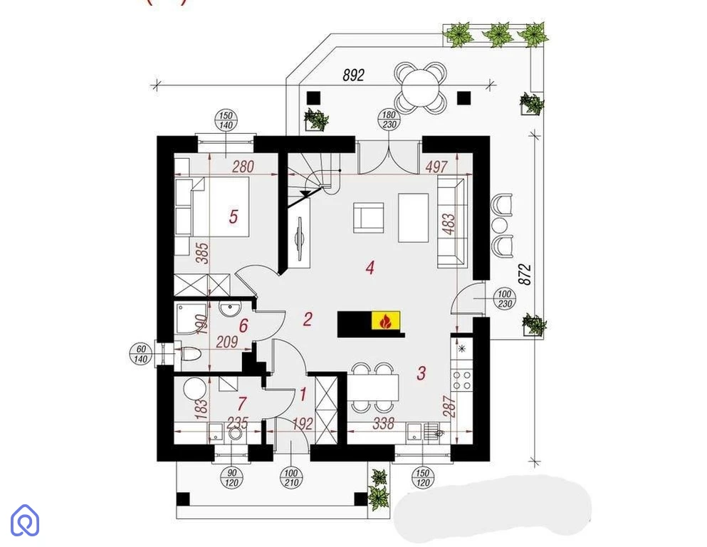Prosta i tradycyjna bryła, przestronne, jasne wnętrza, salon z kominkiem i tarasem.