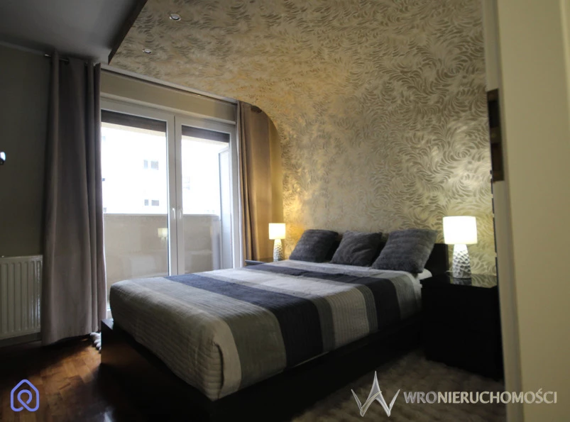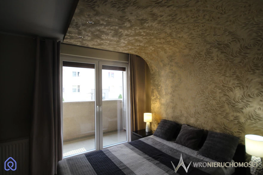 Sypialnia oferuje komfortową przestrzeń do odpoczynku, a jej dużym atutem jest bezpośrednie wyjście na balkon, co pozwala stworzyć dodatkowe kameralne miejsce relaksu, niezależne od części dziennej mieszkania.