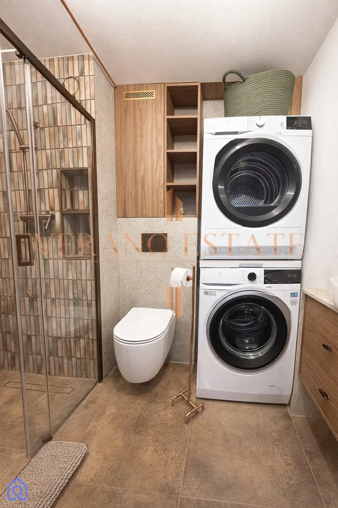 łazienki z prysznicem, pralką i suszarką.