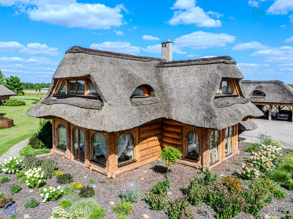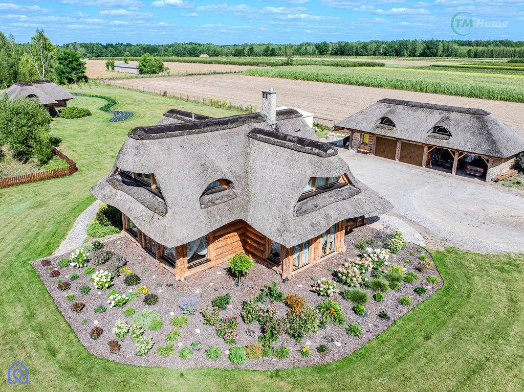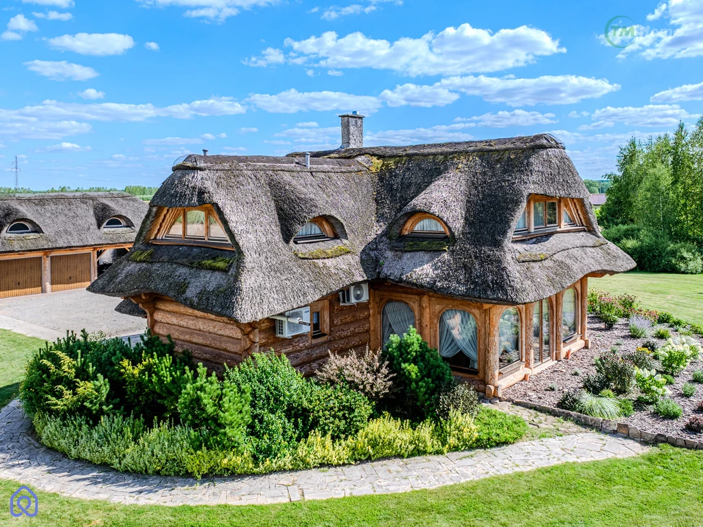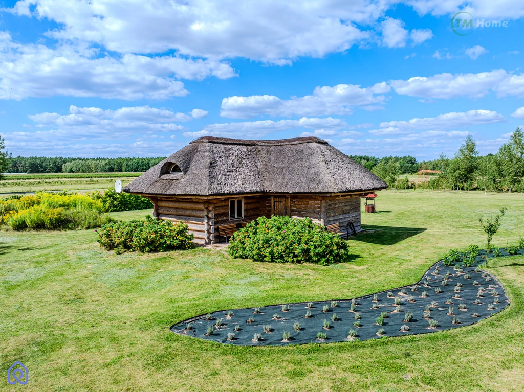 1. Dom mieszkalny z bala o powierzchni 184 m2, postawiony na betonowych słupach, wyposażony w klimatyzację, ogrzewany kominkiem z płaszczem wodnym oraz gazem.