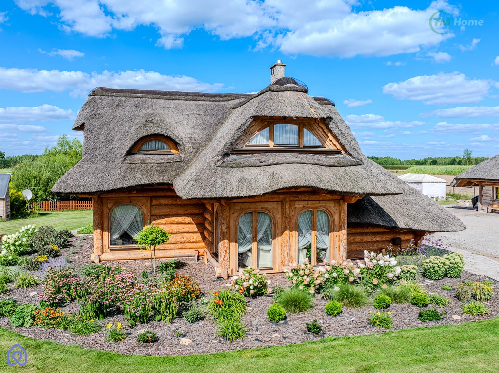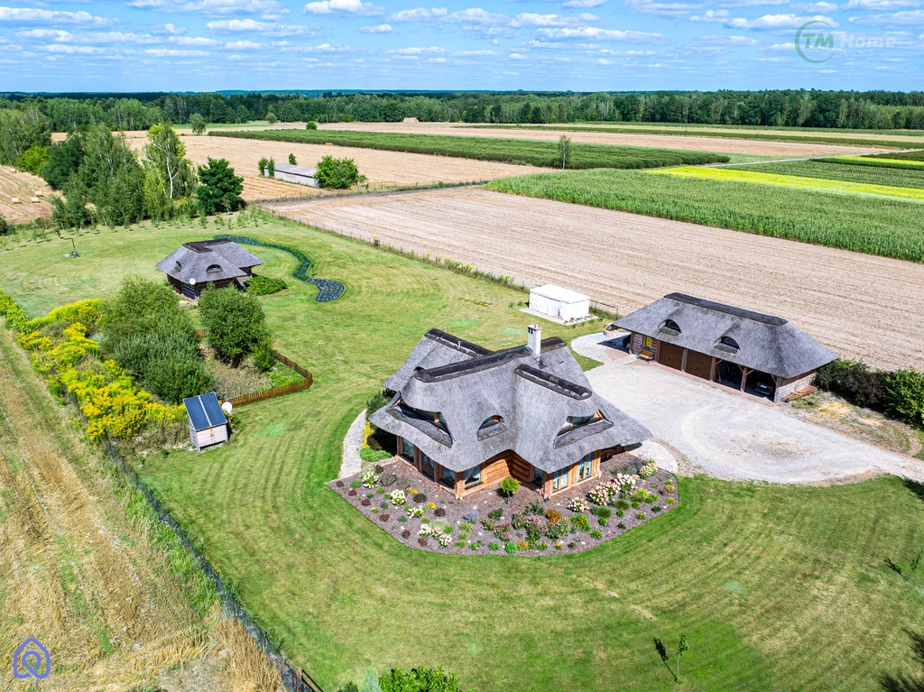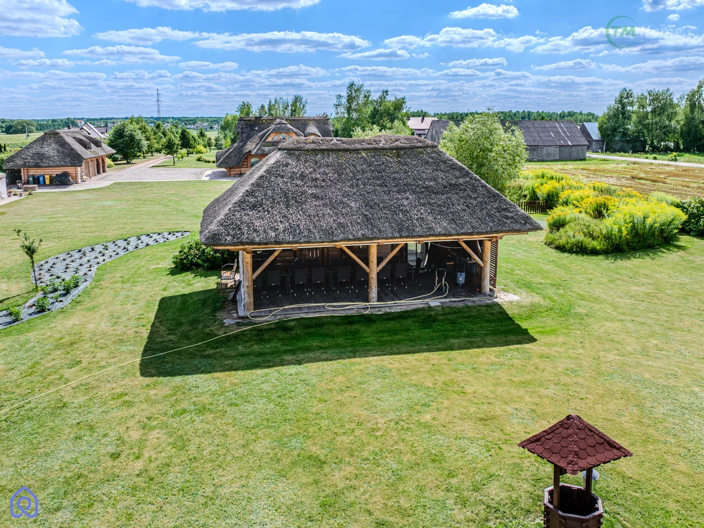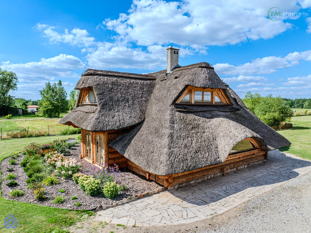 1. Dom mieszkalny z bala o powierzchni 184 m2, postawiony na betonowych słupach, wyposażony w klimatyzację, ogrzewany kominkiem z płaszczem wodnym oraz gazem.
